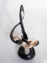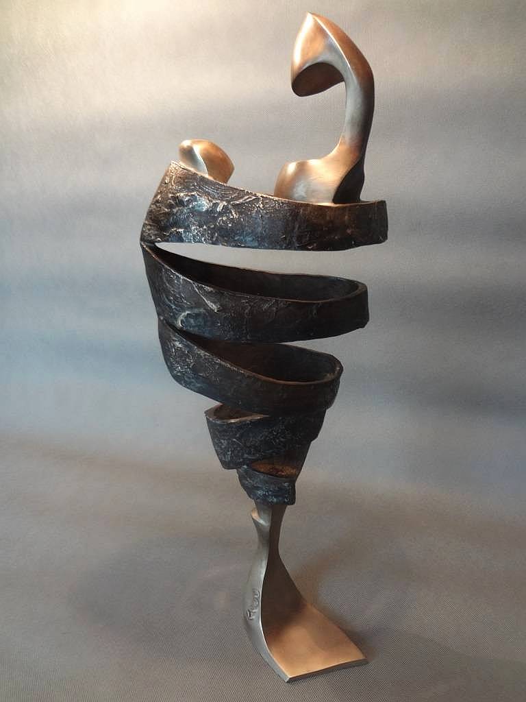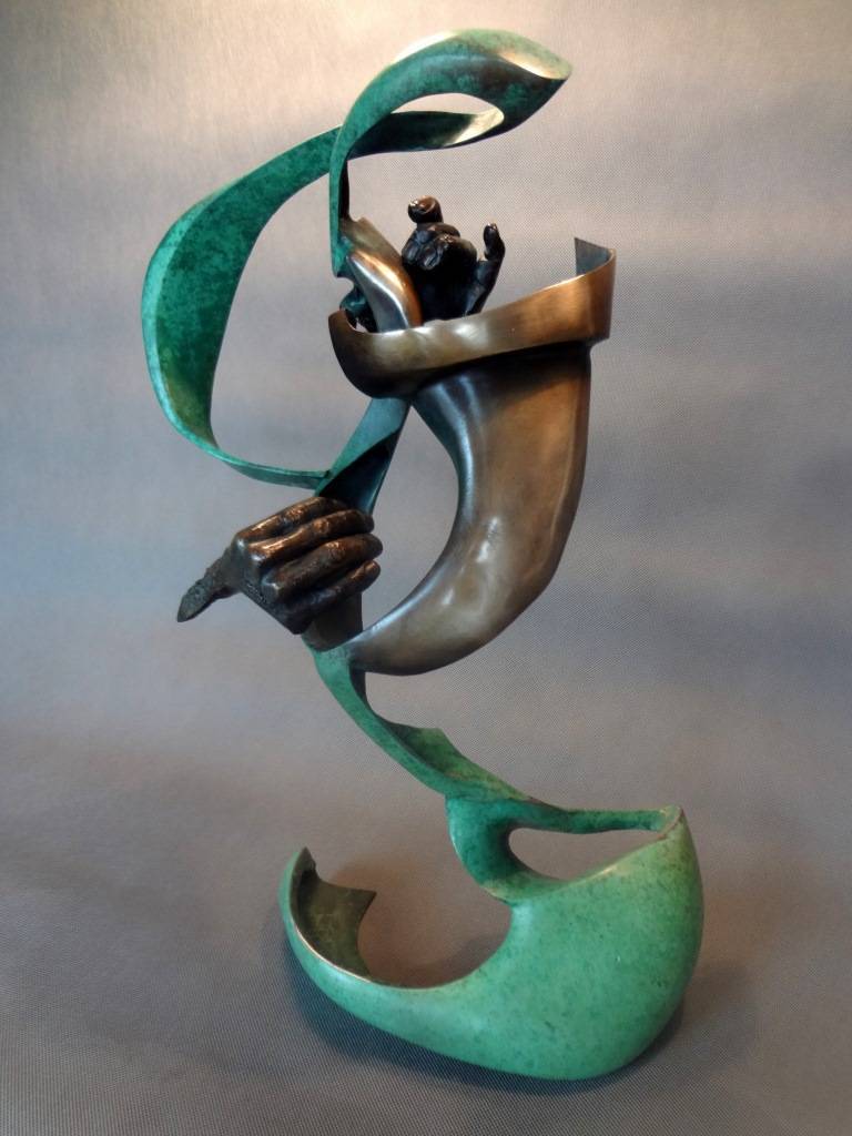 Słuchając brzmienia saksofonu, słyszę głębię, elegancję i dostojność. Jest to instrument dodatkowo bliski memu sercu, ponieważ mój syn od małego gra właśnie na saksofonie, wprawiając mnie w zadumę i podziw z dźwięków które potrafi z niego wydobyć. Dodatkowo, mieszkając przed długi czas w kraju gdzie ten instrument został wynaleziony, miałam okazje podziwiać jego formę w wielu miejscach, włączając muzea, rzeźby w parkach, restauracje,itp. co wpłynęło w pewnym stopniu na sympatie jaką mam do samego własnie instrumentu, jego brzmienia i formy. W rzeźbie „Zaczarowany Saksofon” przedstawiam abstrakcyjna formę klucza wiolinowego, który gra na saksofonie. Ponieważ nowoczesna forma rzeźb coraz bardziej odchodzi od realistycznych form i detali, ręce stają się coraz rzadziej występującą częścią moich rzeźb. Wciąż pozostają one jednak moja ulubiona do rzeźbienia realistyczna forma i z melancholią wracam do pierwszych rzeźb, w których ręce były bardzo uwidocznionym, odzwierciedlającym emocje, motywem moich rzeźb. W rzeźbie “Zaczarowany Saksofon” pokusiłam się wyrzeźbić je raz jeszcze.
