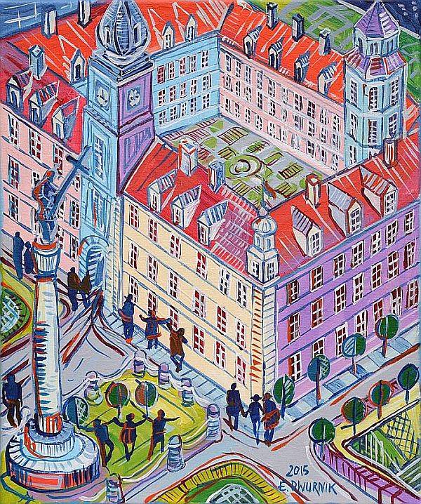EDWARD DWURNIK urodził się w 1943 roku w Radzyminie. Ukończył warszawską Akademię Sztuk Pięknych. Malarstwo studiował w pracowni prof. Eugeniusza Eibischa oraz rzeźbę w pracowni prof. Jerzego Jarnuszkiewicza. W 1970 roku uzyskał dyplom pod kierunkiem prof. Krystyny Łady-Studnickiej. W 1965 roku rozpoczął (kontynuowany do dnia dzisiejszego) cykl rysunków, akwarel i obrazów olejnych pt. "Podróże autostopem" (cykl IX). Zainspirowany wystawą prac Nikifora w 1965 roku w Kielcach, stworzył pracę (Rysunek nr 1) od której artysta datuje swoją twórczość (13 czerwca 1965 r.). Malarz przejął od Nikifora m.in. lekkość kompozycji oraz przedstawianie architektury z lotu ptaka. Głównym tematem cyklu "Podróże autostopem" są polskie jak europejskie miasta i miasteczka. Artysta na swoich płótnach, próbuje zawrzeć charakter przedstawianego krajobrazu. Cechą szczególną tych płócien jest nagromadzenie najważniejszych budowli danego miejsca. Artysta przedstawiając architekturę nie stosuje zgodności typograficznej. Budynki, które w rzeczywistości znajdują w dużym oddaleniu od siebie, na płótnach sąsiadują ze sobą. W pracach pojawia się również warstwa narracyjna. Zdarza się, że zaznaczone kilkoma pociągnięciami pędzla postaci są skrzętnie opisane ("Kraków zimą"). Warto zaznaczyć o kolorystyce prac. Malarz stworzył grupę obrazów utrzymanych w błękitach (m.in. "Kraków niebieski", "Warszawa", "Szczecin"). Obok nich znajdują się płótna o bogatej kolorystyce, w których mnogość odcieni jest zachwycająca. Najnowsze prace artysty charakteryzują się kontrastowo zestawionymi kolorami, o niezwykłej intensywności. Od lat 70. powstało kilkanaście innych cykli malarskich, m.in. "Sportowcy" (komiksowe spojrzenie na codzienność PRL-u), "Drodze na Wschód", "Od Grudnia do Czerwca" (upamiętniające ofiary stanu wojennego w Polsce). Artysta był wielokrotnie nagradzany np.za cykl prac pt. "Robotnicy" otrzymał w 1981 roku Nagrodę Krytyki Artystycznej natomiast seria dzieł pt. "Warszawa", została wyróżniona Nagrodą Kulturalną "Solidarności"; Nouvelle Biennale de Paris (1985), Nagrodą Fundacji Sztuki Współczesnej (1992).