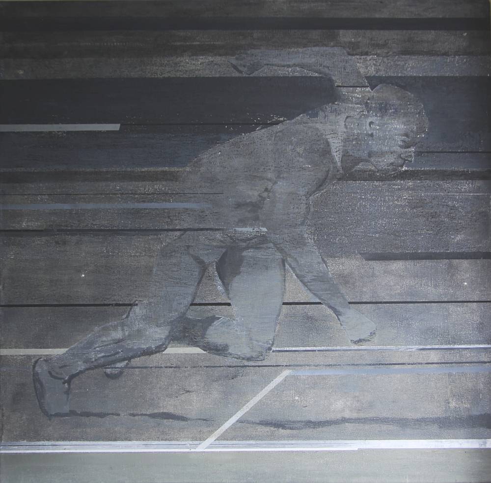 Biegnące postacie pojawiły mi się jako oderwane, zawieszone w dziwnej przestrzeni. Przestała ona być bieżnią, nie widać wiwatujących tłumów, nie widać linii mety. Może to arena, na której ludzkie ciało poddane jest dręczeniu? Scena dramatu? Klatka? Zacząłem przyglądać się temu z pewnym niezadowoleniem, rodzajem smutku, współczucia. O czym jest ta opowieść? O sporcie? O bieganiu? Biec bez celu? Cały swój wysiłek wkładając tylko w jakość tego biegu? Czy mogę biec bez myśli o mecie? Nie Gdzie jest meta? Oni chyba wiedzą, biegną tak szybko. Dogonię ich. Nie oddycham. Muszę uważać żeby nie nabawić się kontuzji. Moje mięśnie muszą być rozgrzane. Trening. Zwycięstwo. Sława. Prestiż.