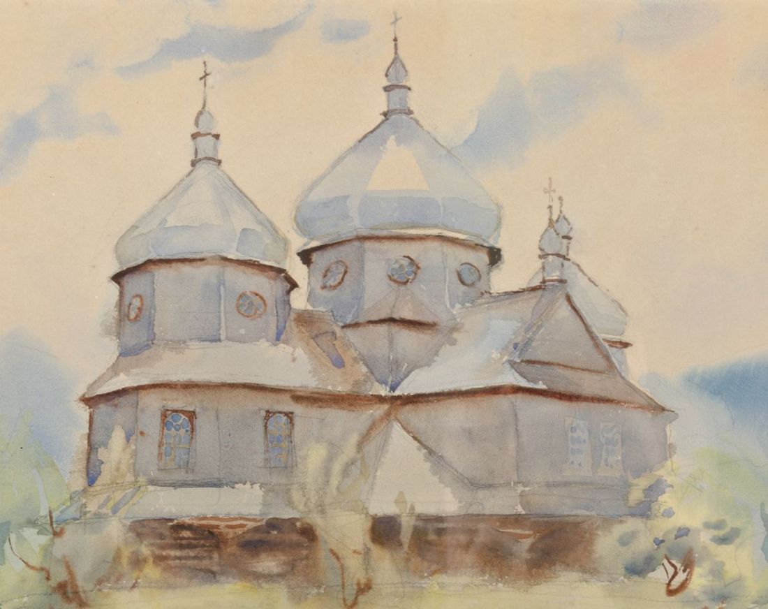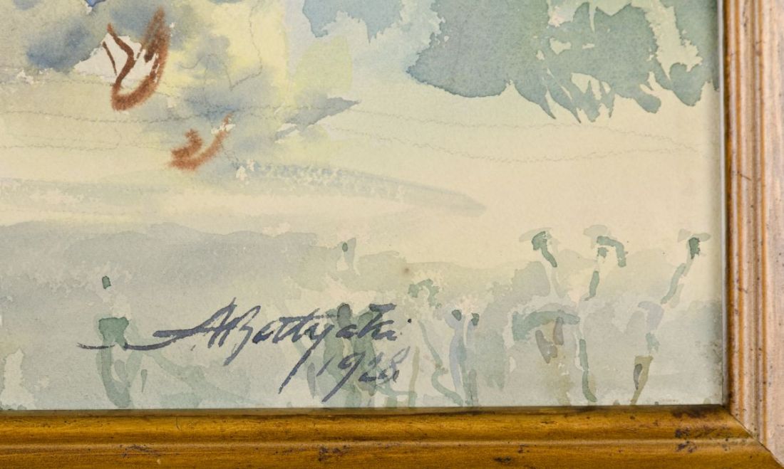 | sygn. p.d.: "ABatycki | 1928" Opis pracy: Akwarela przedstawia widok na zbudowaną w pierwszej dekadzie XX wieku drewnianą cerkiew pw. śś. Piotra i Pawła w Kosmaczu na Huculszczyźnie. Warto wspomnieć, że w latach dwudziestych, w których powstał omawiany obraz, Adam Batycki dużo uwagi poświęcał tematom huculskim. Praca dobrze oddaje wygląd świątyni. Spod warstwy malarskiej prześwituje wykonany pewną ręką rysunek. Umiejętne prowadzenie pędzla, przyjemna kolorystyka i skontrastowane partie o wyraźnych oraz rozmytych konturach świadczą o umiejętnościach artystycznych malarza. | |