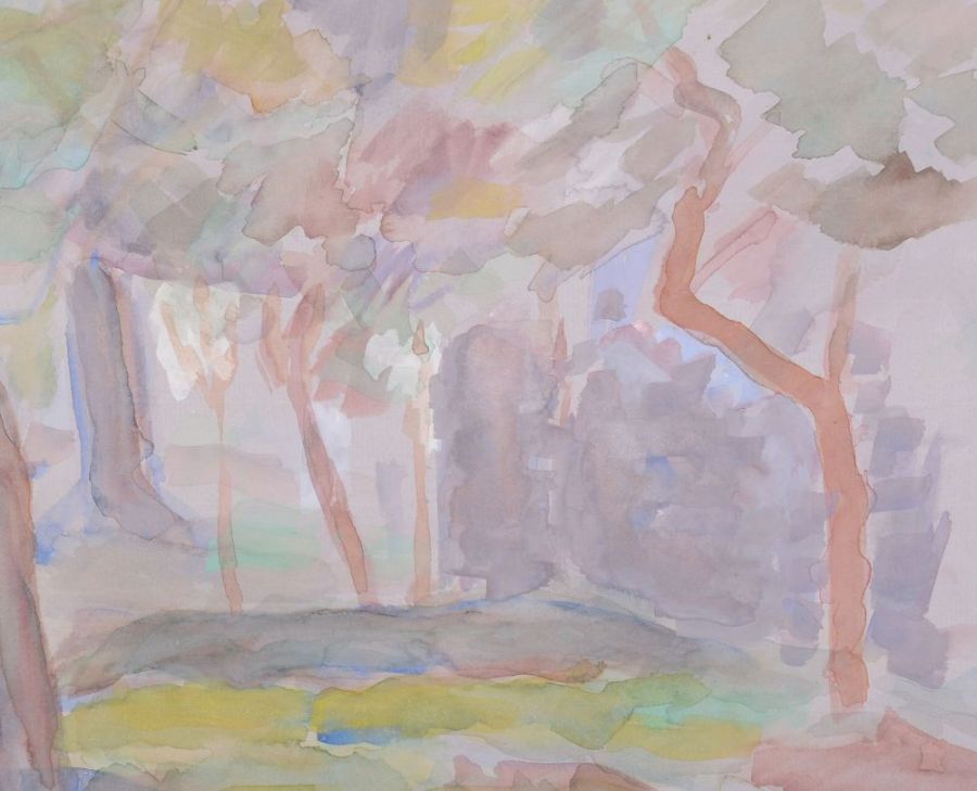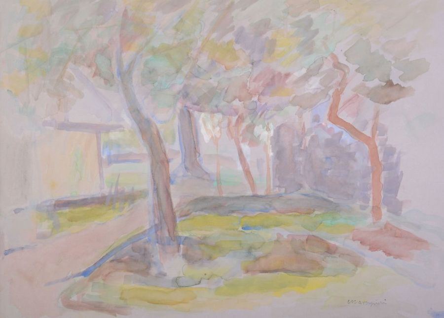 | sygnowany p.d.: "Marczyński" opis pracy: Praca Adama Marczyńskiego ukazuje widok na zielone podwórze. Na pierwszym planie widoczne są drzewa, dalej przestrzeń ograniczają ściany budynków. Obraz malowany jest energicznie, łączącymi się ze sobą, ale niezależnymi plamami barwnymi. Kolorystyka jest wąska, dominują odcienie szarości, zieleni oraz brązu. Tematyka pejzażu dosyć często pojawia się w dorobku artysty, towarzyszyła mu bowiem przez cały okres jego twórczości. Praca dostępna tylko w ofercie internetowej - możliwość obejrzenia w galerii po wcześniejszym umówieniu. [KONTAKT] | |