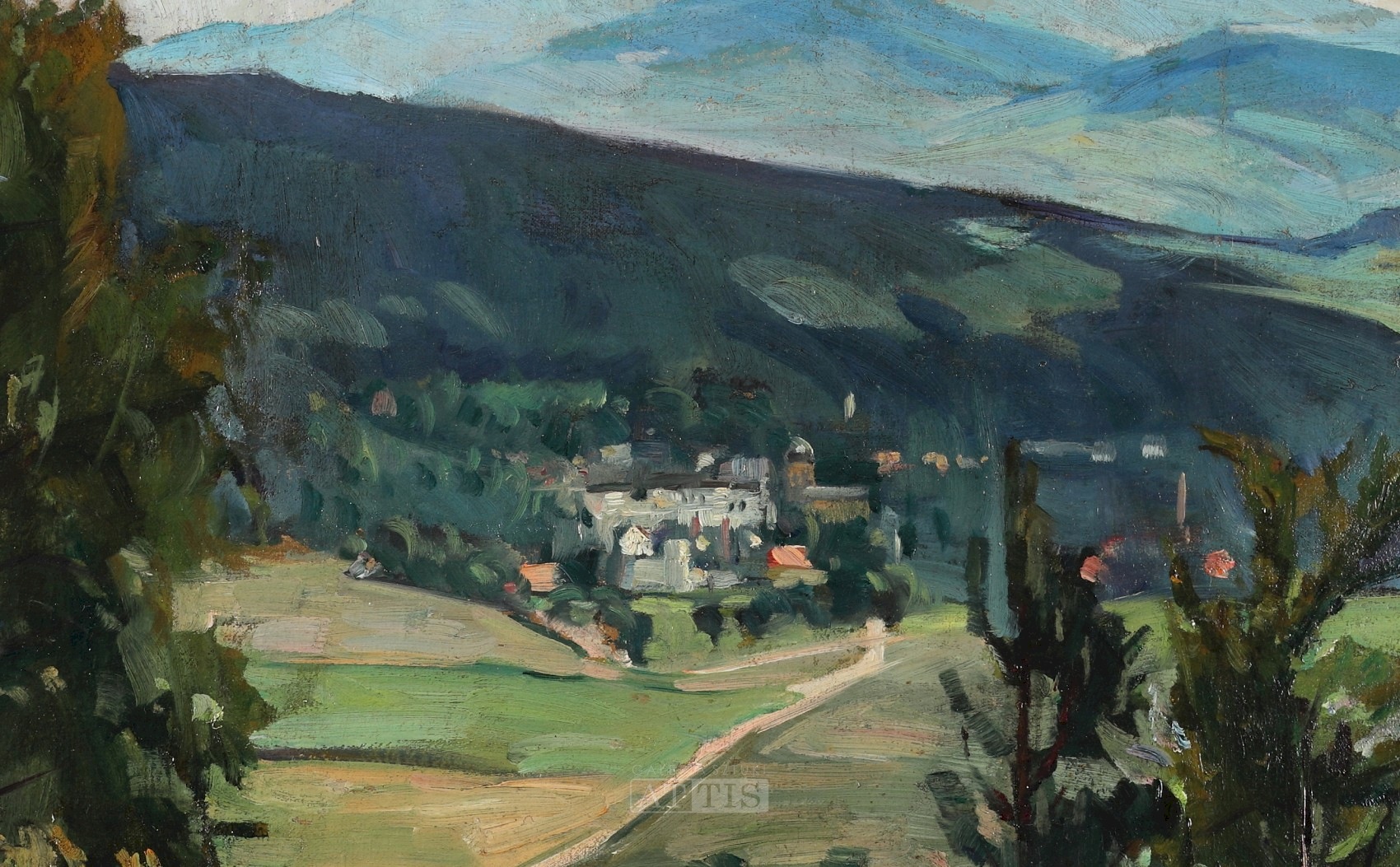 OPIS PRACY: W sztuce Alfreda Nickischa dominują obrazy ukazujące pejzaże. Sam malarz przez dużą część życia był związany ze Śląskiem, przez co niezwykle częstym motywem w jego malarstwie były widoki Sudetów. Prezentowana kompozycja przedstawia zieloną dolinę, która przywodzi na myśl skojarzenia z krajobrazem Karkonoszy. | |