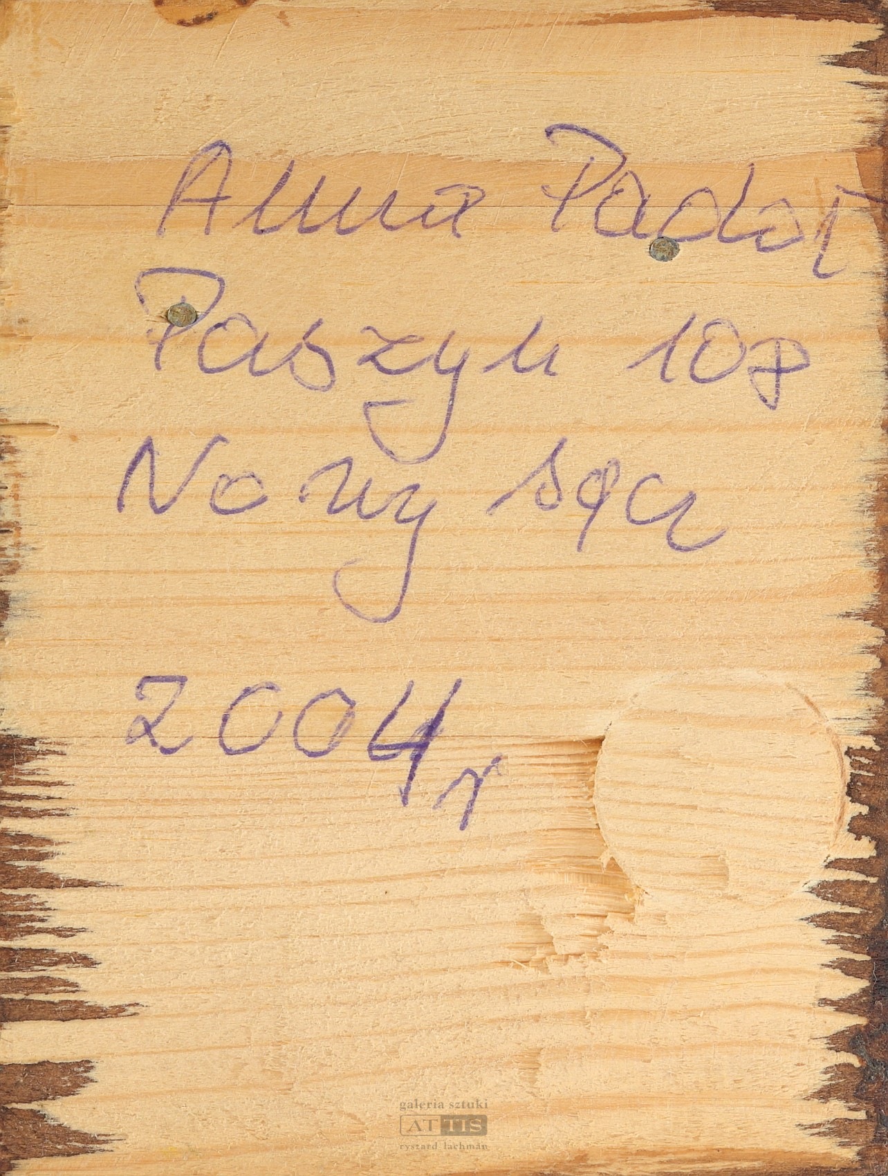 | Sygnowana na spodzie podstawy: "Anna Padoł | Paszyn 108 | Nowy Sącz | 2004 r" Rzeźba została sprzedana w ramach XVII Aukcji Dzieł Sztuki Krakowskiego Domu Aukcyjnego: Sztuka ludowa i prymitywizm (18 VIII 2022) [ZOBACZ WYNIKI] | |