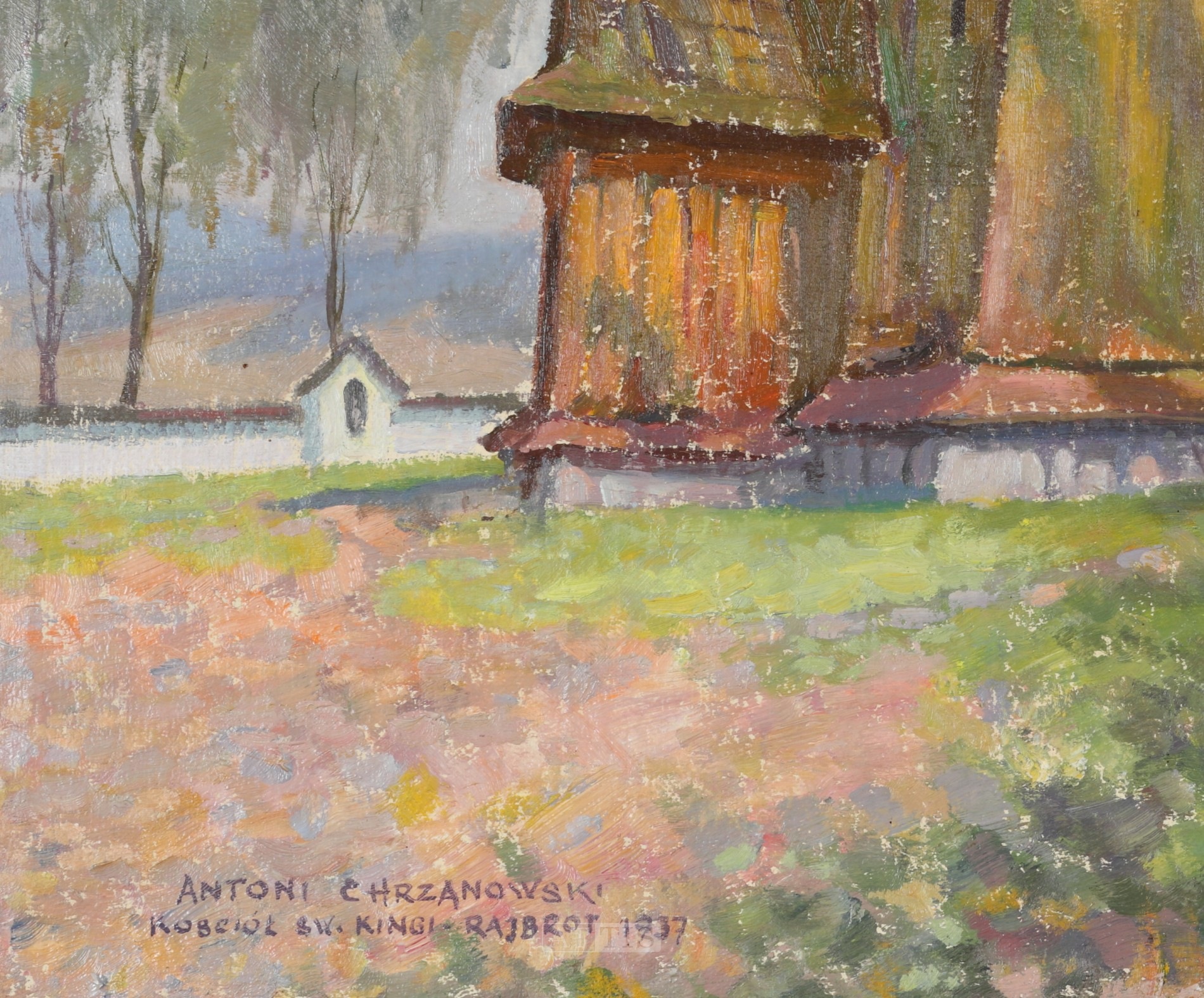| Sygnowany i opisany l.d.: "ANTONI CHRZANOWSKI | KOŚCIÓŁ ŚW. KINGI RAJBROT 1937" | |