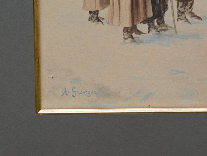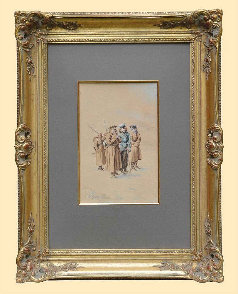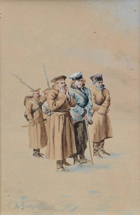 | Sygnowany l.d.: "A. Grottger" Akwarela prezentuje studium postaci do pracy pt. "W drodze na Syberię" 1867 r. (Zbiory Muzeum Narodowe w Poznaniu). W 1867 roku, artysta w liście do narzeczonej Wandy Monné opisywał pracę nad rysunkiem przedstawiającym pochód na Sybir: "Na rysunku trzech biedaków ze śniegu wyrosło. Będzie ich mniej więcej ze trzydziestu kilku tak dużych, że w głowie każdego wyrazić coś wypadnie. Zadanie dosyć trudne, jedną myśl trzydzieści razy napisać, a zawsze inaczej..." (fragment listu Grottgera do narzeczonej, Paryż 9 I 1867, Arthur i Wanda, t. II) Przytoczony fragment listu odnosi się opisu grupy postaci znajdującej się w lewej części kompozycji: "W drodze na Syberię" (fragment pracy). Grupa ta jest analogiczna do mężczyzn przedstawionych w studium postaci na opisywanej akwareli. (Agnieszka Stefańczyk - historyk sztuki) Bibliografia: 1. Jadwiga Puciata-Pawłowska "Artur Grottger", Toruń 1962, s. 162. 2. Magdalena Czapska-Michalik, "Artur Grottger" (1837-1867), Kolekcja Ludzie Czasy Dzieła, 2007, s. 41. * Praca jest reprodukowana w nr 11-12, 2017 czasopisma "Spotkania z Zabytkami" w artykule na temat twórczości artysty: "W sto osiemdziesiątą rocznicę urodzin i sto piećdziesiątą śmierci Artura Grottgera" (s. 30-31) | |