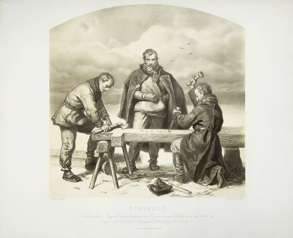 | Tekst znajdujący się pod kompozycją: l.d. - "Rysował Artur Grottger", p.d. - "Litogr. Józef Bauer w Wiedniu", c. - "Sybiracy | Towarzystwo Przyjaciół sztuk Pięknych we Lwowie, swoim Członkom za rok 1869/70. Oryginał jest własnością hr. Alfonsyny Dzieduszyńskich we Lwowie.| Odciskano w Reiffensteina i Röscha w Wiedniu." | |