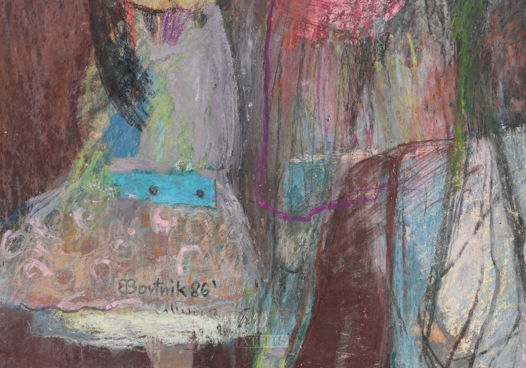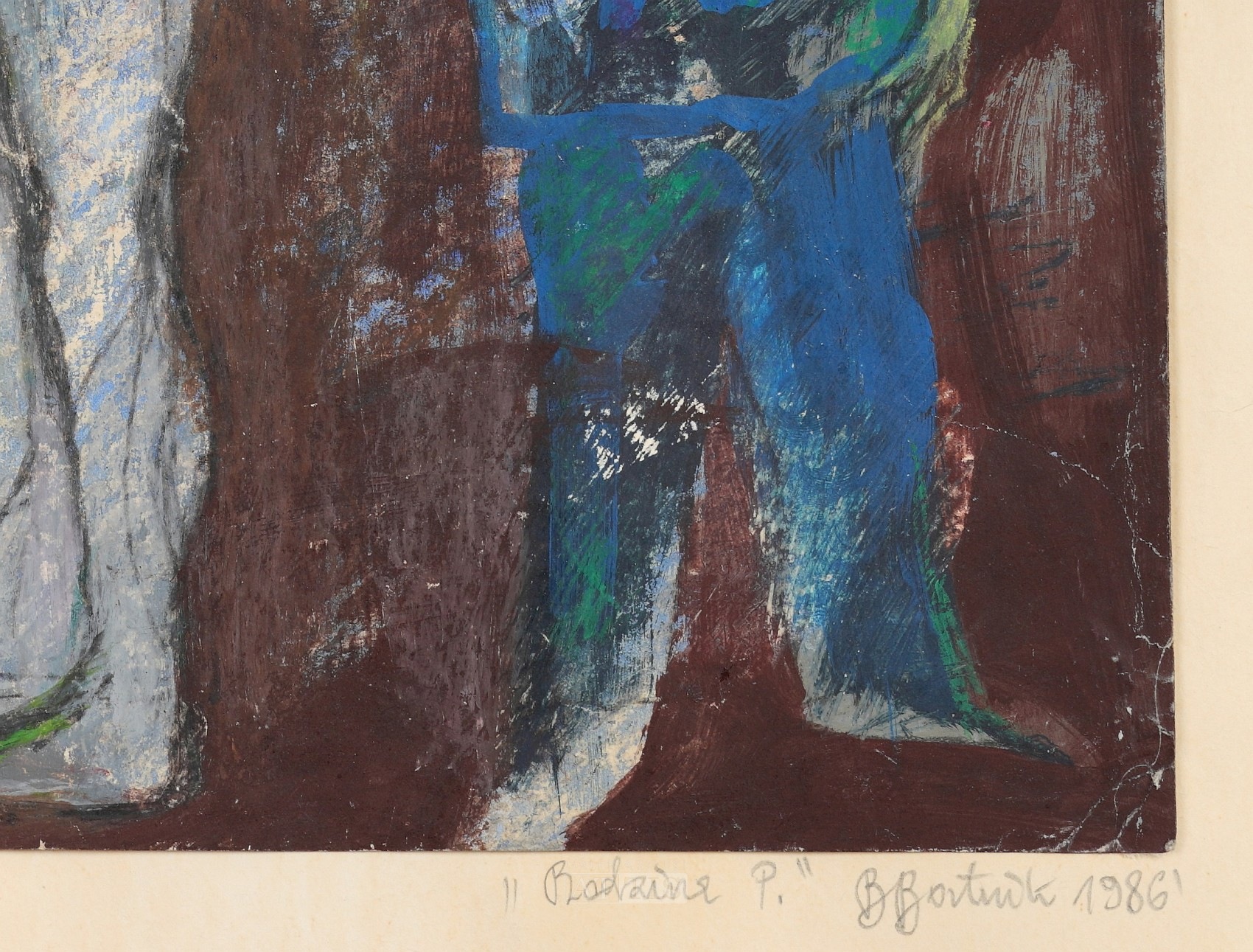| Sygnowany i datowany l.d.: "Bortnik 86'" Opisany ołówkiem na arkuszu tła: "Rodzina P. BBortnik 1986'" Przy krawędziach podłoża widoczne ślady zagięć papieru. Przy górnej krawędzi widoczne pojedyncze ubytki malatury. | |