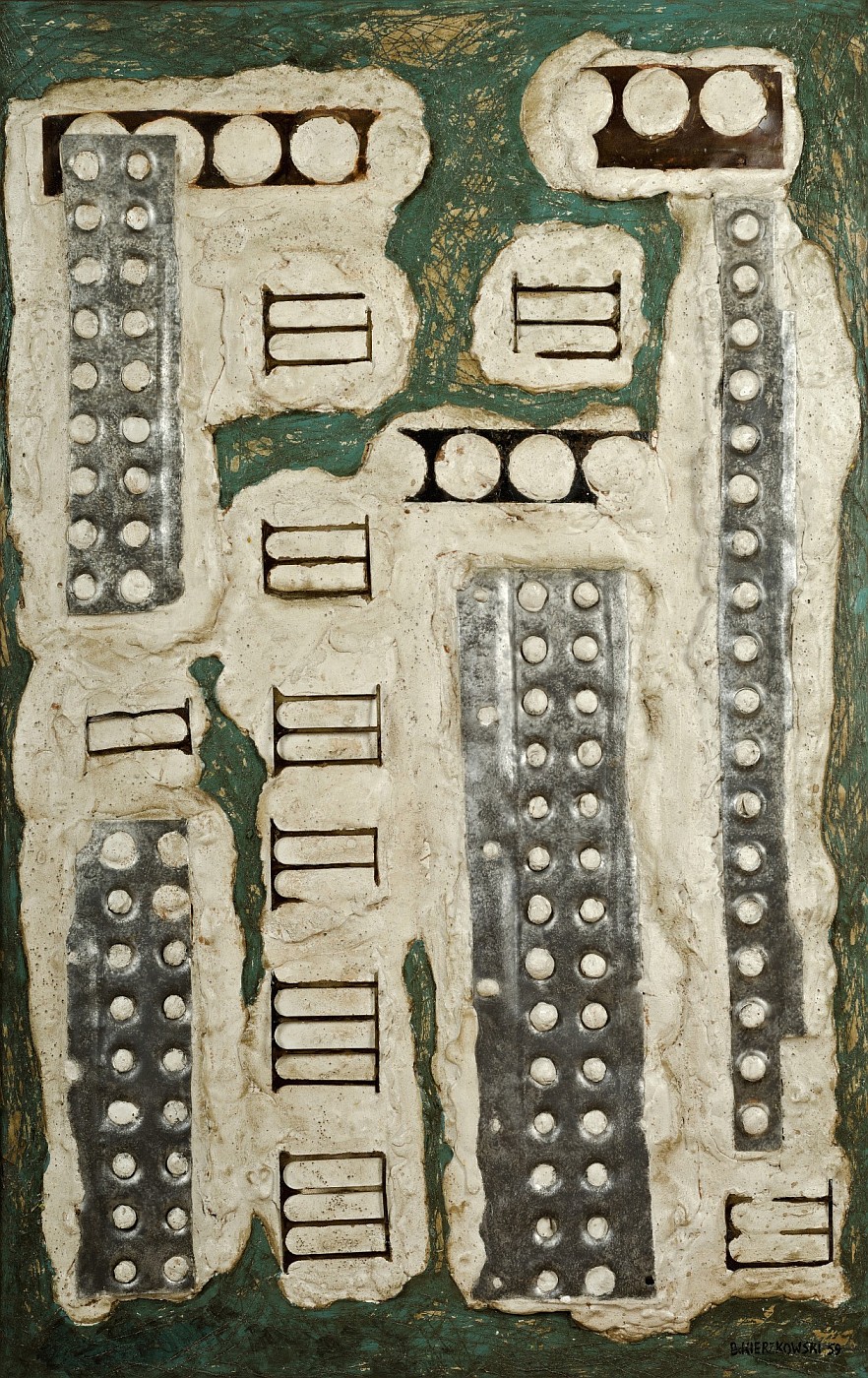 | Sygnowany p.d.: "B. KIERZKOWSKI 59" Opisany na odwrocie: "BRONISŁAW | KIERZKOWSKI | 1959", "KOMPOZYCJA | FAKTUROWA | NR 443/59" | |