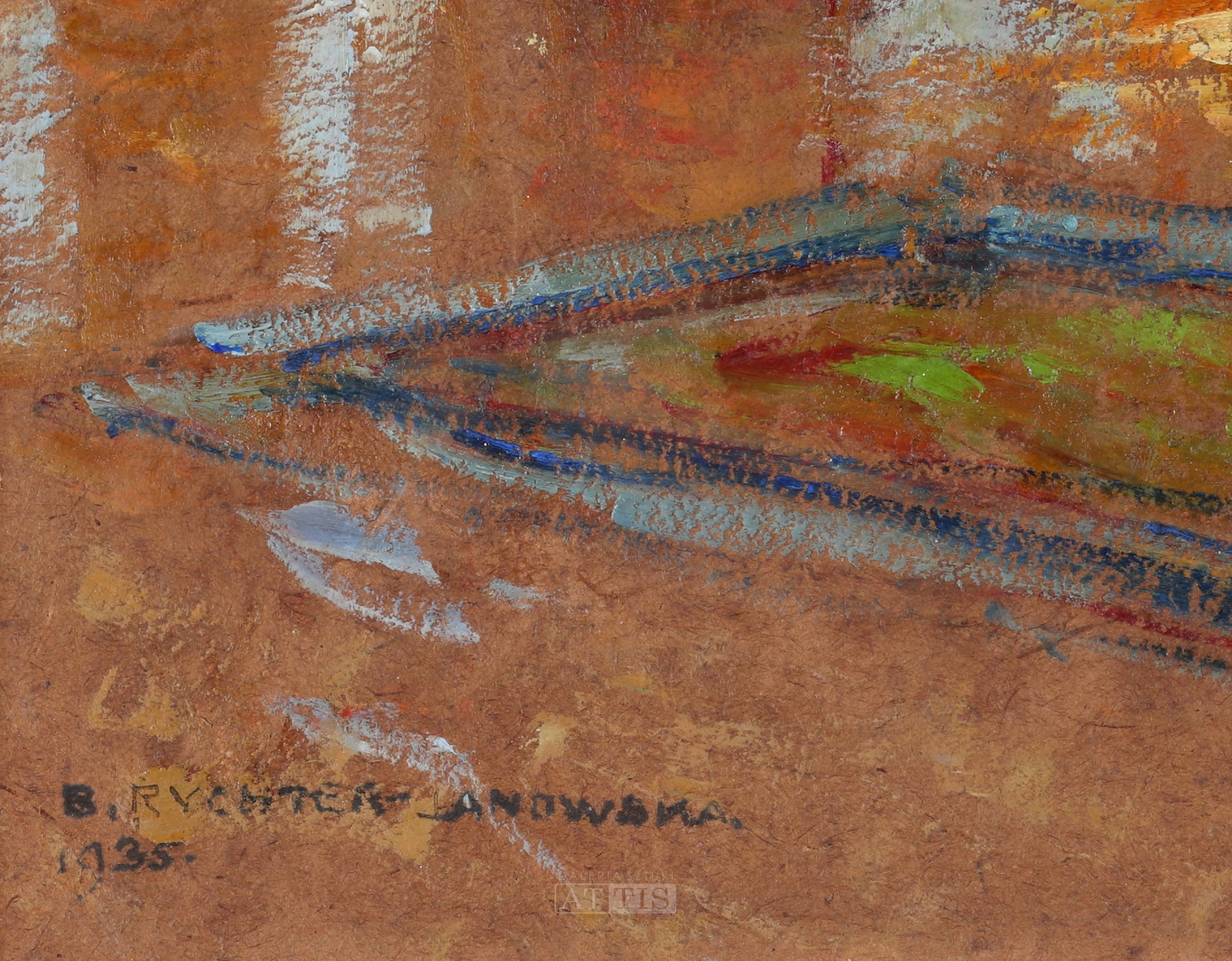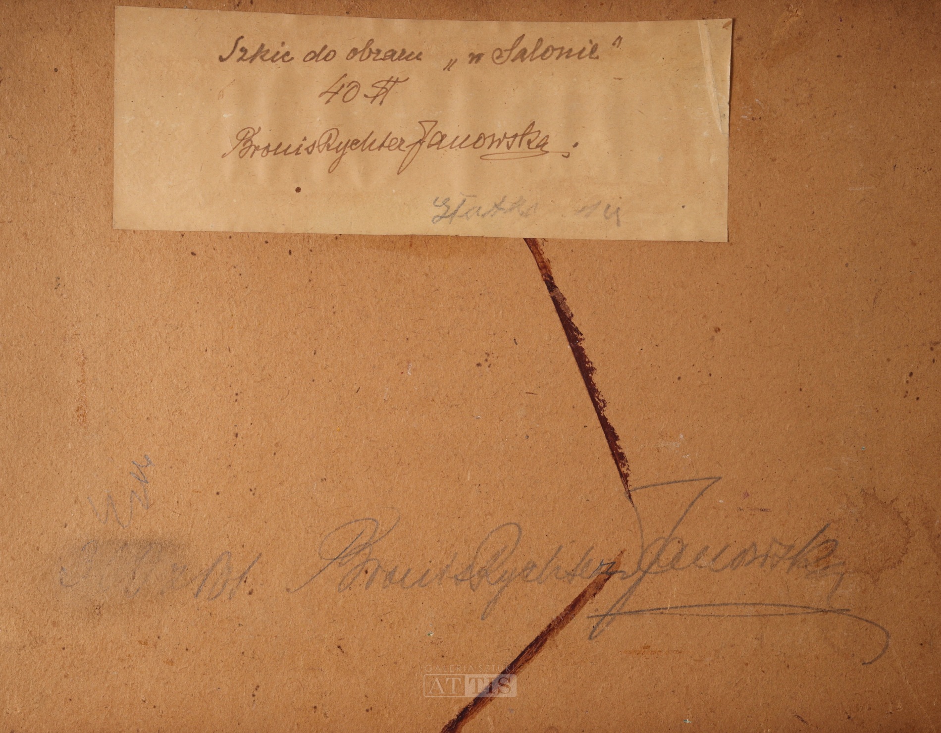 | Sygnowany i datowany l.d.: "B. RYCHTER-JANOWSKA. | 1935." Opisany na odwrocie: "Szkic do obrazu "w Salonie" | BronisRychter-Janowska"; "BronisRychter-Janowska" Widoczne przetarcia malatury. | |