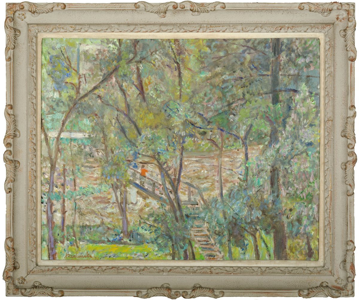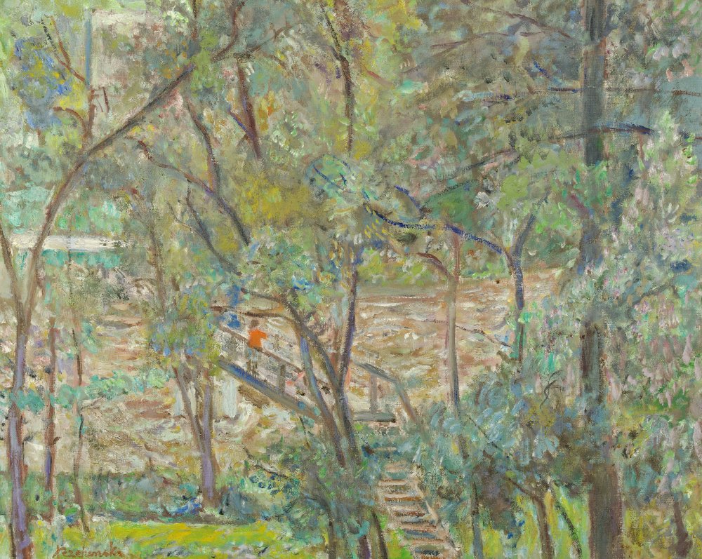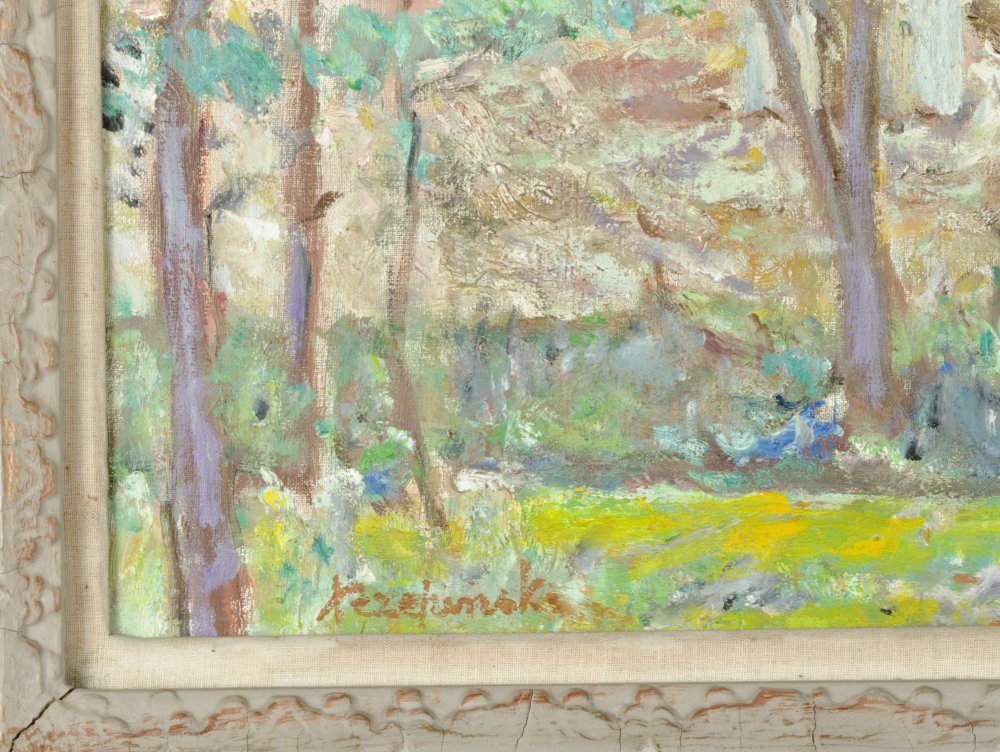 | Sygnowany l.d.: "Rzepiński" OPIS PRACY: Czesław Rzepiński był jednym z czołowych przedstawicieli postimpresjonistycznego nurtu koloryzmu w sztuce polskiej. Prezentowane płótno to ciekawy pejzaż, w którym artyście udało się uchwycić atmosferę, jaka panuje w przyrodzie po przejściu burzy. Zielono-błękitna kompozycja ożywiona została akcentem oranżu obecnym w stroju postaci spacerującej po drewnianej kładce. | |