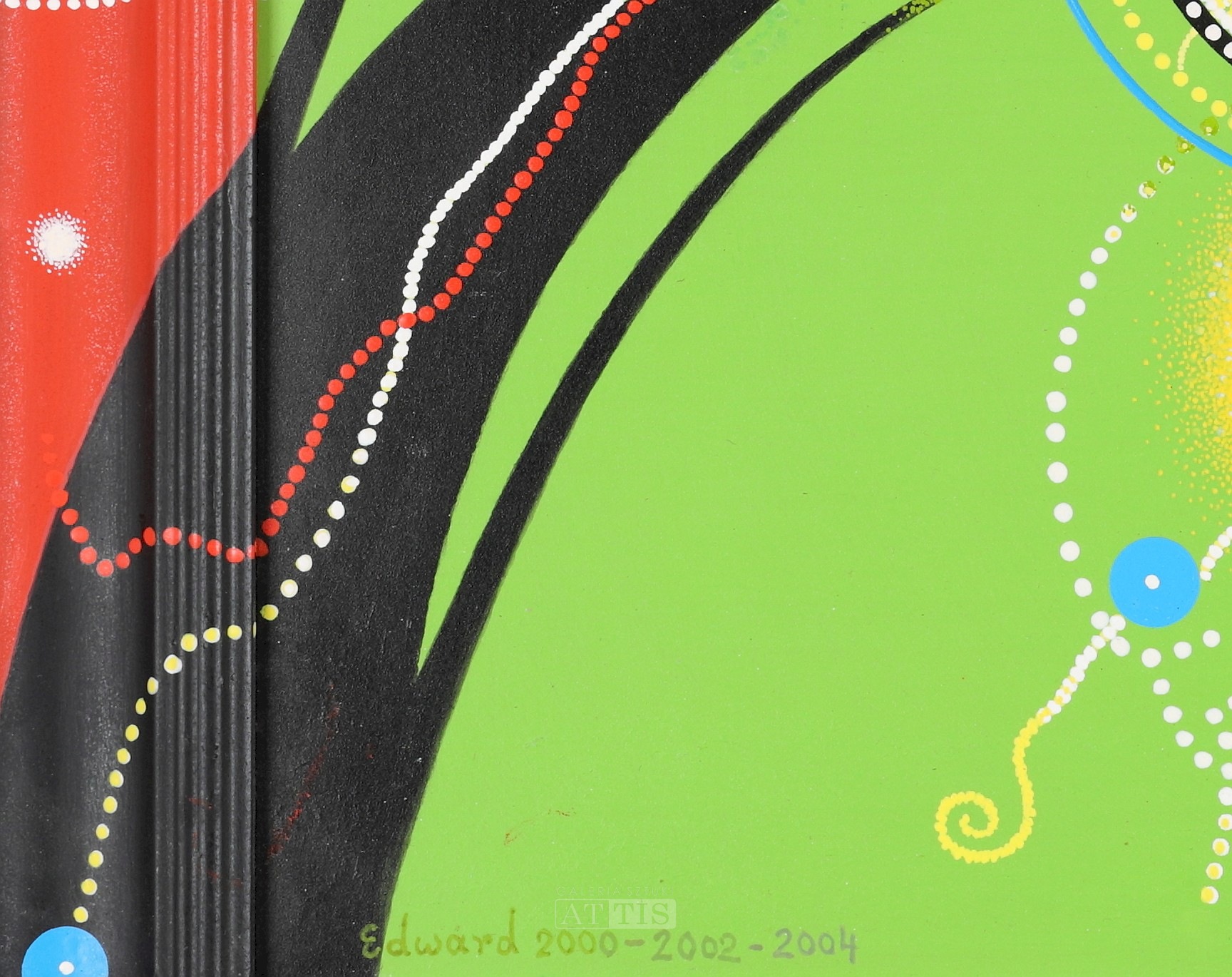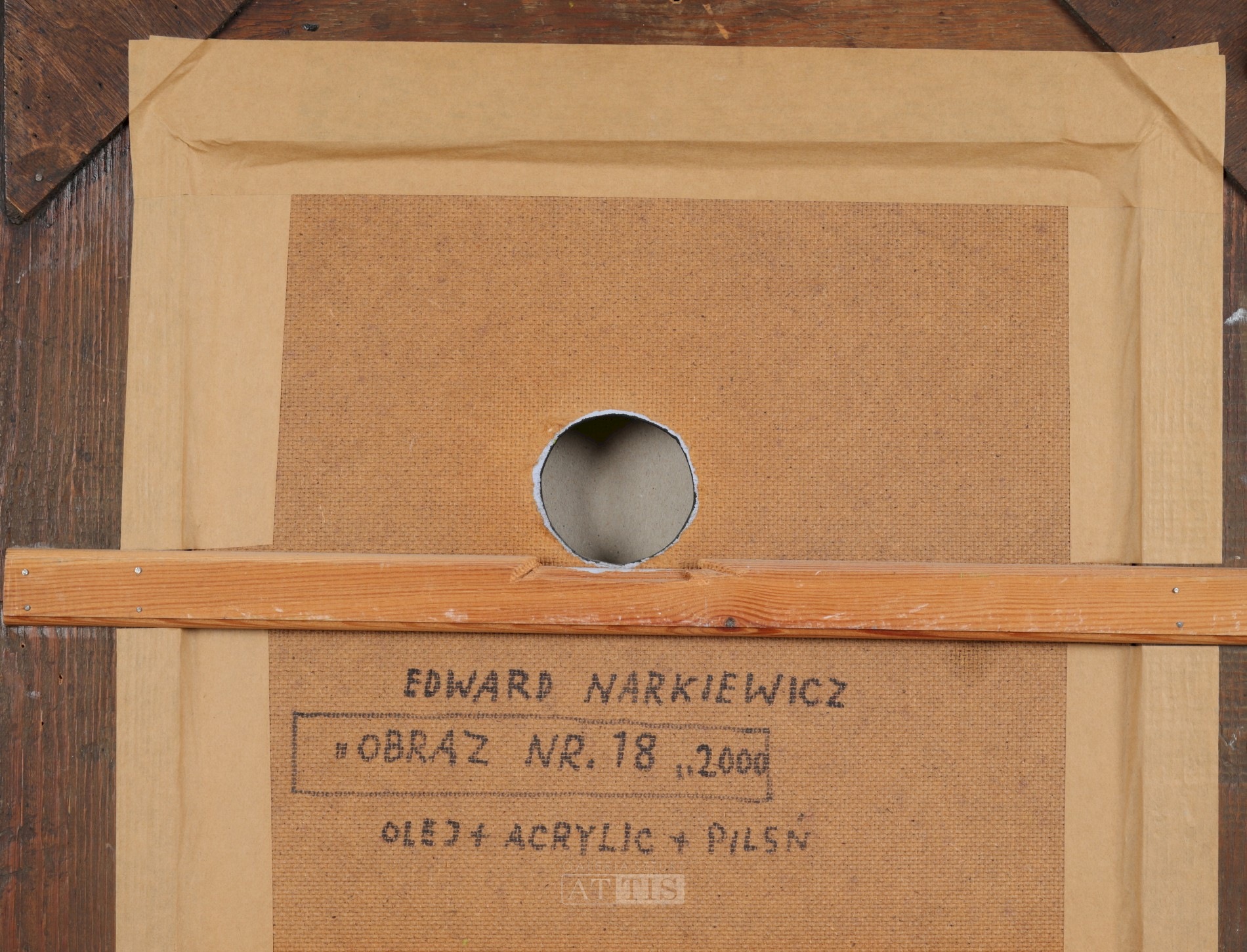 | Sygnowany i datowany l.d.: "Edward 2000-2002-2004" Opisany na odwrocie: "EDWARD NARKIEWICZ | OBRAZ NR. 18 2000 | OLEJ + ACRYLIC + PILŚŃ" | |