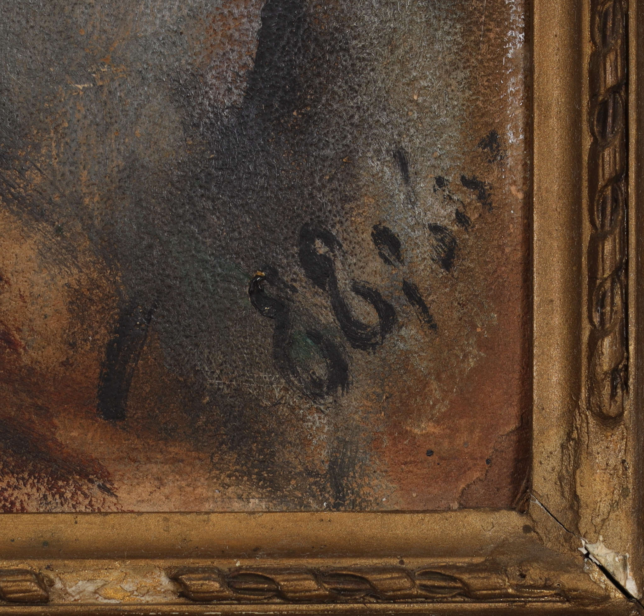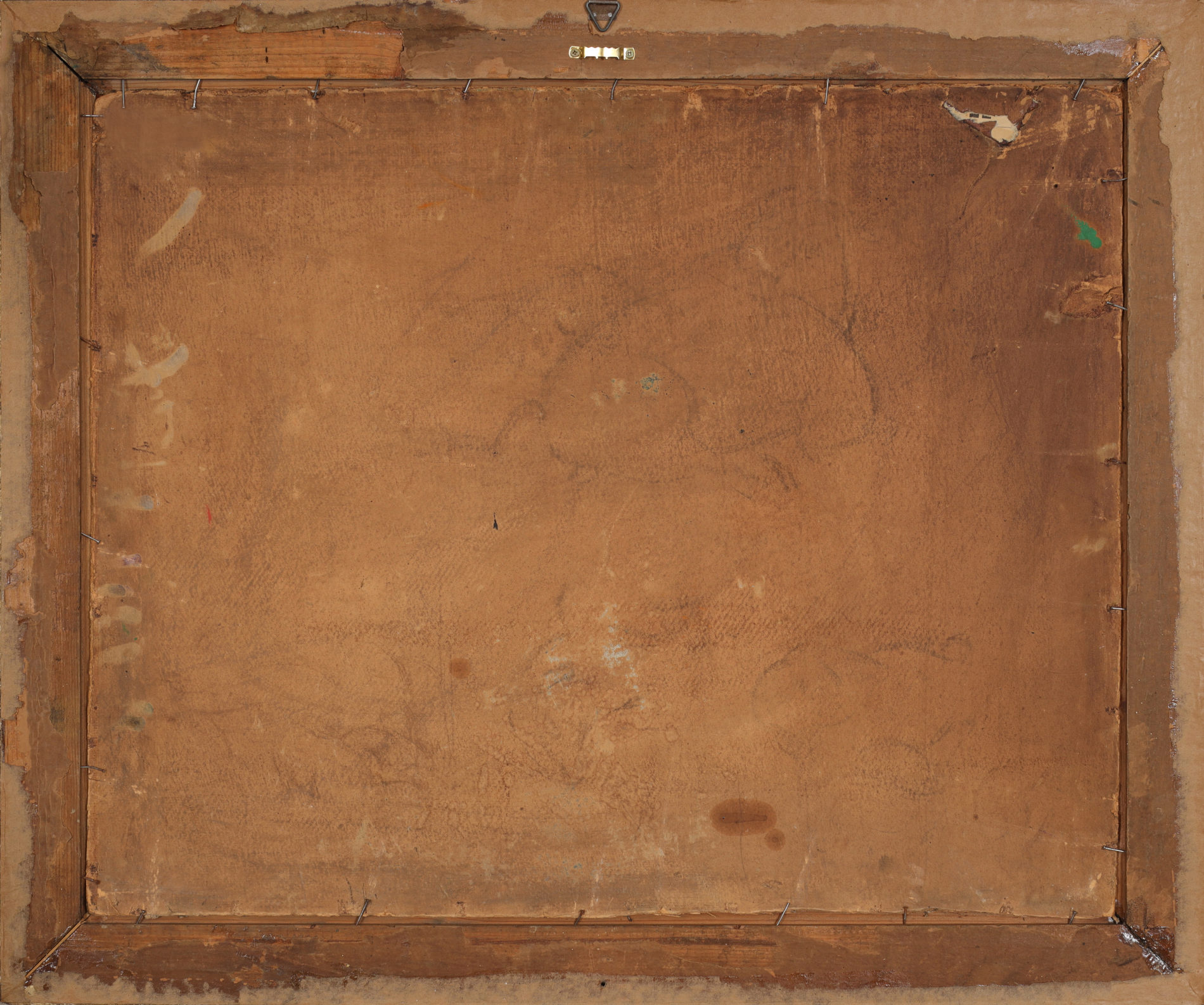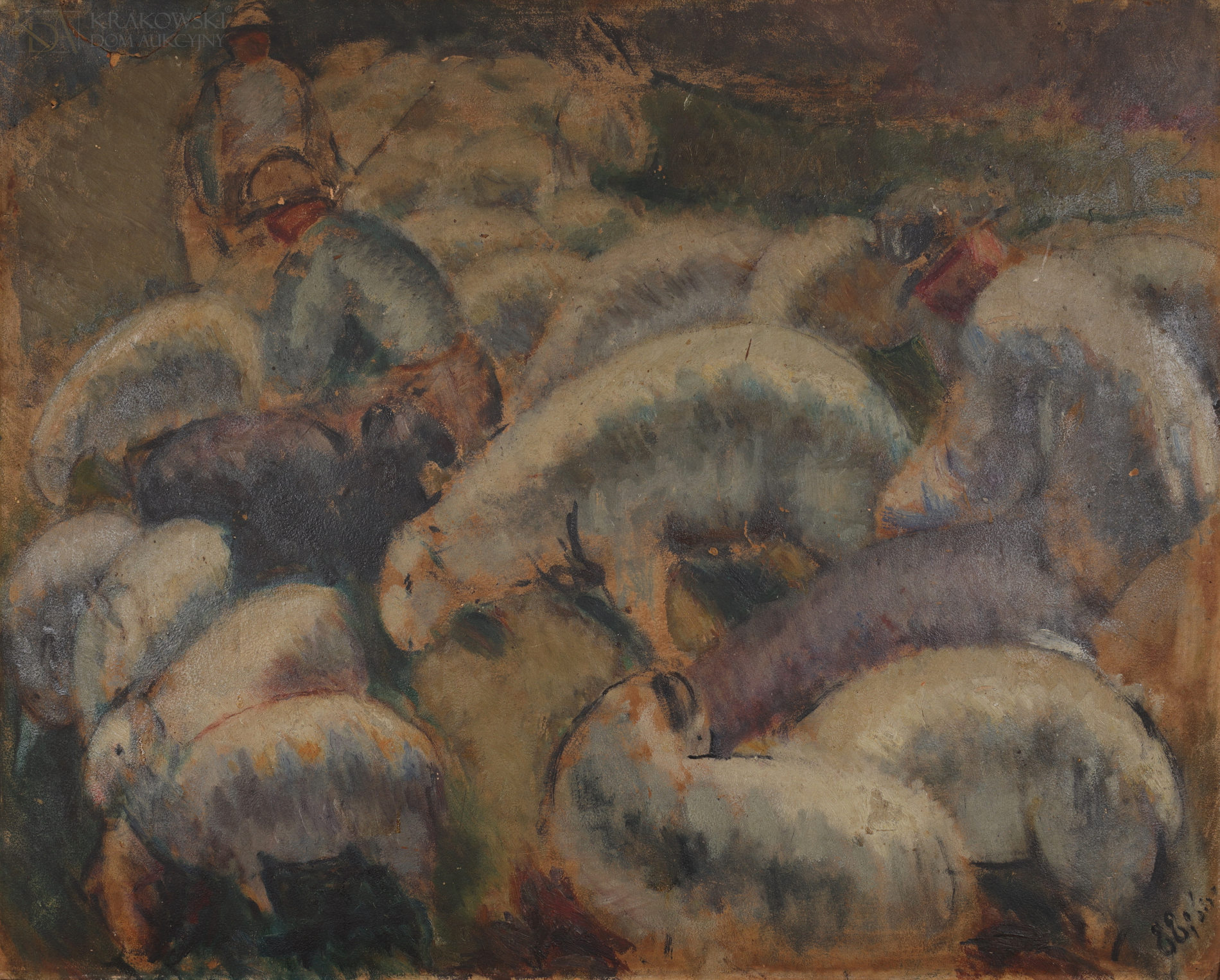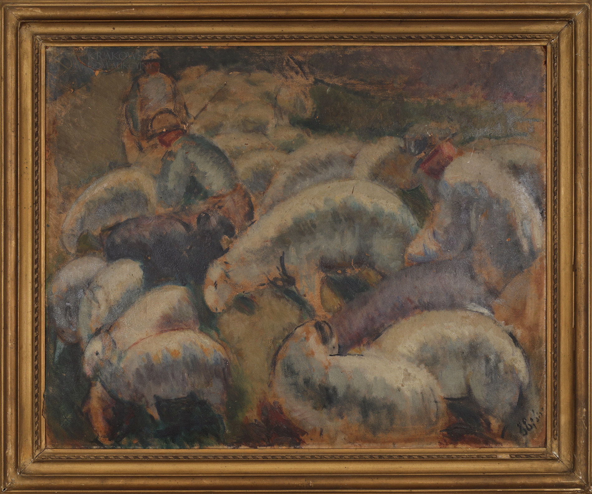 | Sygnowany p.d.: "EEjbisz" Na odwrocie zarys malarskich szkiców owiec. Lokalnie widoczne drobne ubytki i zarysowania malatury. L.g. widoczny ślad pęknięcia tektury. Widoczne wygięcie podłoża. | |