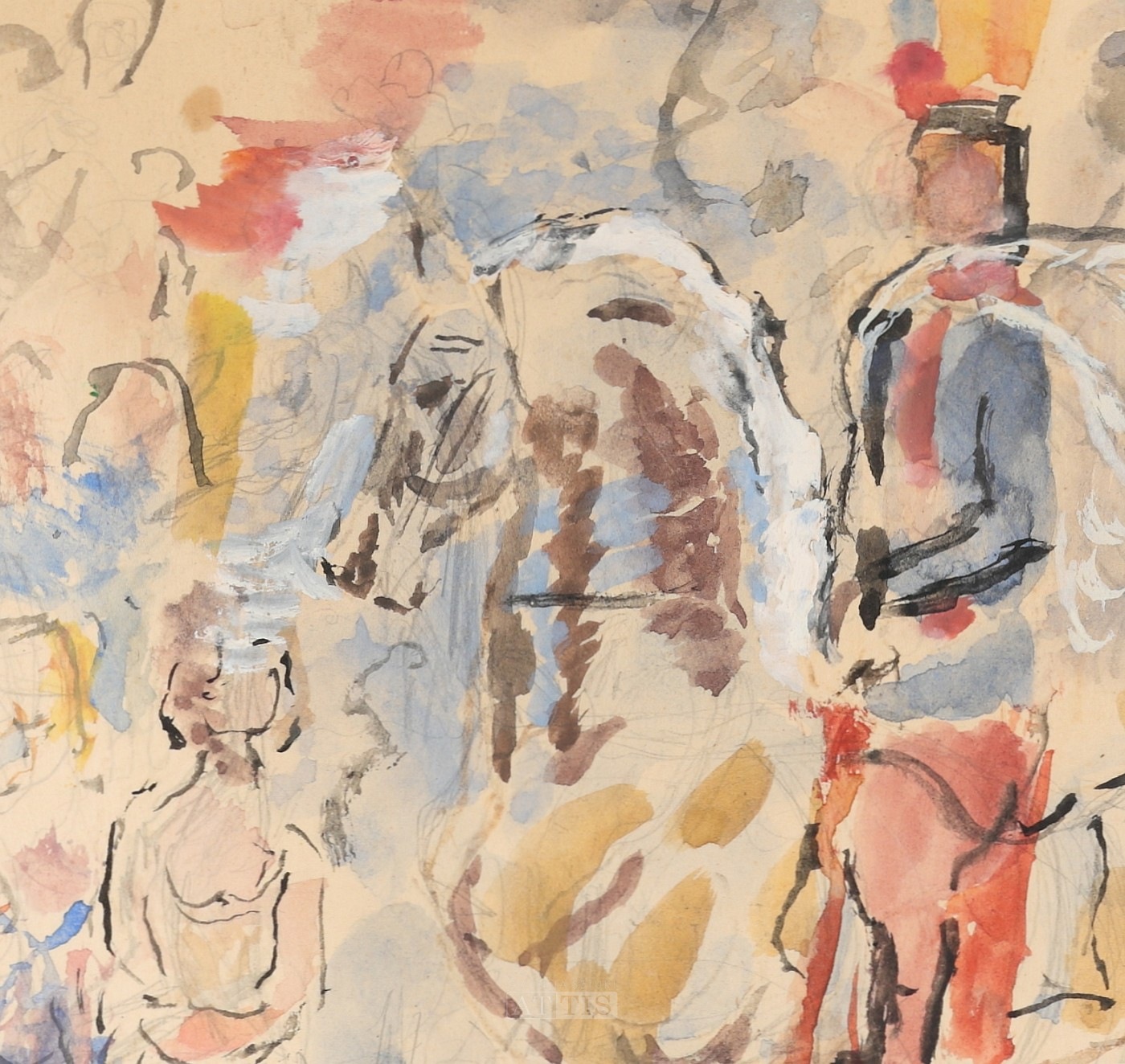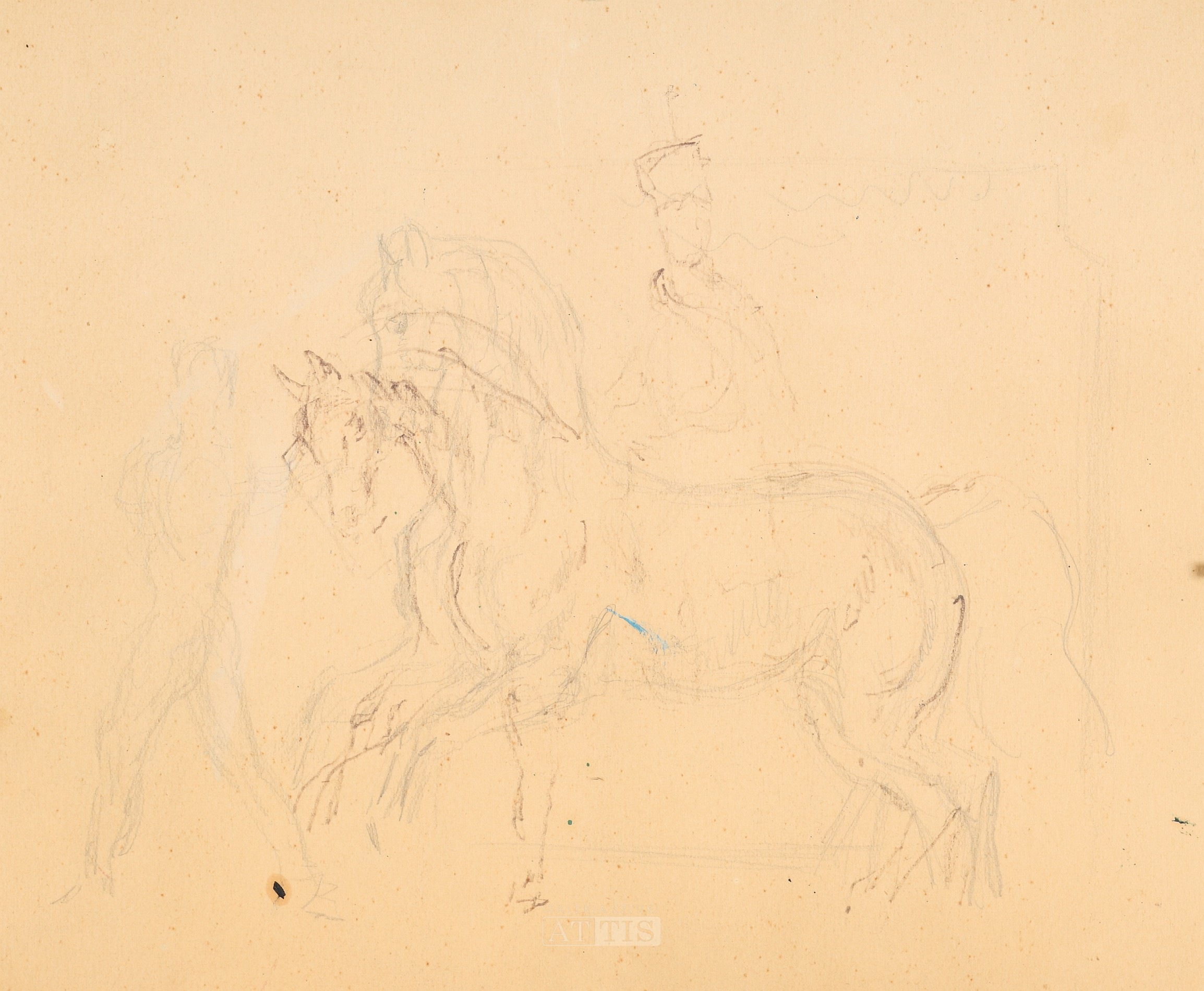 | Sygnowany p.d.: "Eugeniusz Geppert" Na odwrocie szkic ołówkiem z przedstawieniem jeźdźca na koniu i towarzyszącej mu postaci. | |