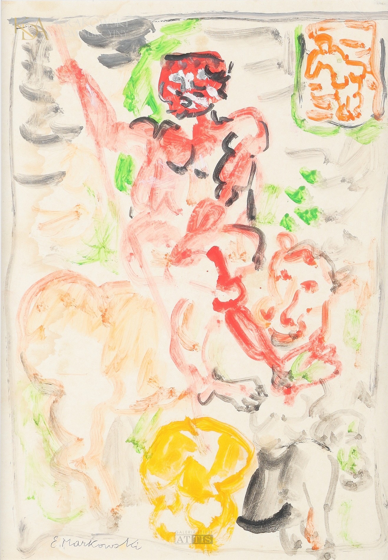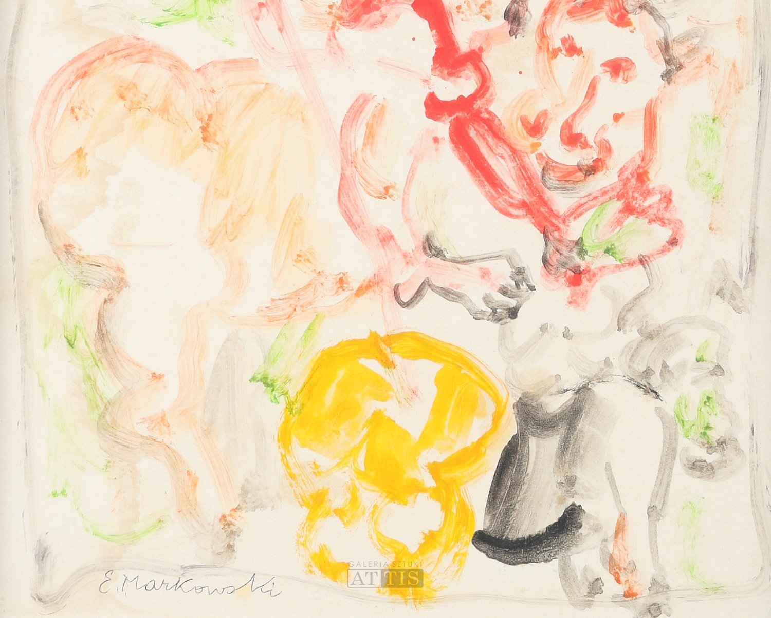 Eugeniusz Markowski uprawiał malarstwo i rysunek, zajmował się również grafiką użytkową oraz scenografią (współpracował z teatrami warszawskimi oraz z Operą Gdańską). Jego ekspresyjna, emocjonalna sztuka wpisuje się w nurt nowej figuracji. Tworzył dynamiczne kompozycje figuratywne, na których często pojawiała się zdeformowana, groteskowa postać ludzka lub ludzko-zwierzęca. Zniekształcenia oraz swoista brutalność z jaką w świadomy, antyestetyczny sposób artysta ukazywał bohaterów swoich kontrastowych i jaskrawych kolorystycznie obrazów były odpowiednią formą do prześmiewczego ukazania ciemnych stron egzystencji ludzkiej i siły instynktu.