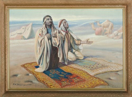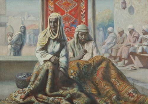 Dobrym przykładem twórczości artysty o tematyce orientalnej jest praca "Sprzedawca i dziewczyna". Malarz przedstawił młodą dziewczynę, rozmawiającą ze sprzedawcą dywanów i biżuterii, który prezentuje jej złoty naszyjnik. Postacie są ukazane w orientalnych strojach, a znajdująca się w tle para ludzi, zabudowania i roślinność oddają niepowtarzalny nastój Bliskiego Wschodu.