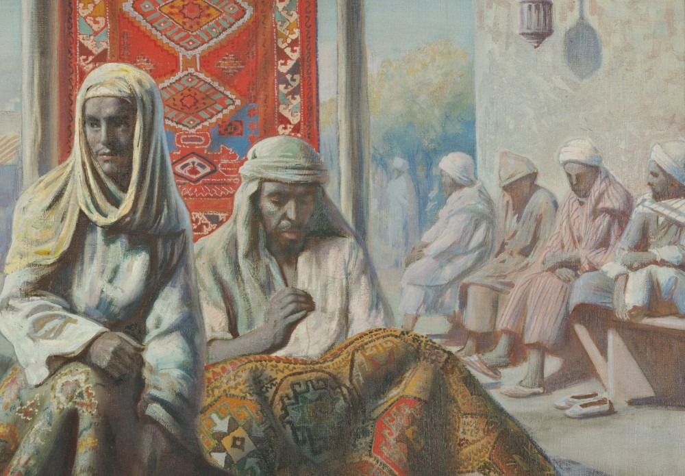 Dobrym przykładem twórczości artysty o tematyce orientalnej jest praca "Sprzedawca i dziewczyna". Malarz przedstawił młodą dziewczynę, rozmawiającą ze sprzedawcą dywanów i biżuterii, który prezentuje jej złoty naszyjnik. Postacie są ukazane w orientalnych strojach, a znajdująca się w tle para ludzi, zabudowania i roślinność oddają niepowtarzalny nastój Bliskiego Wschodu.