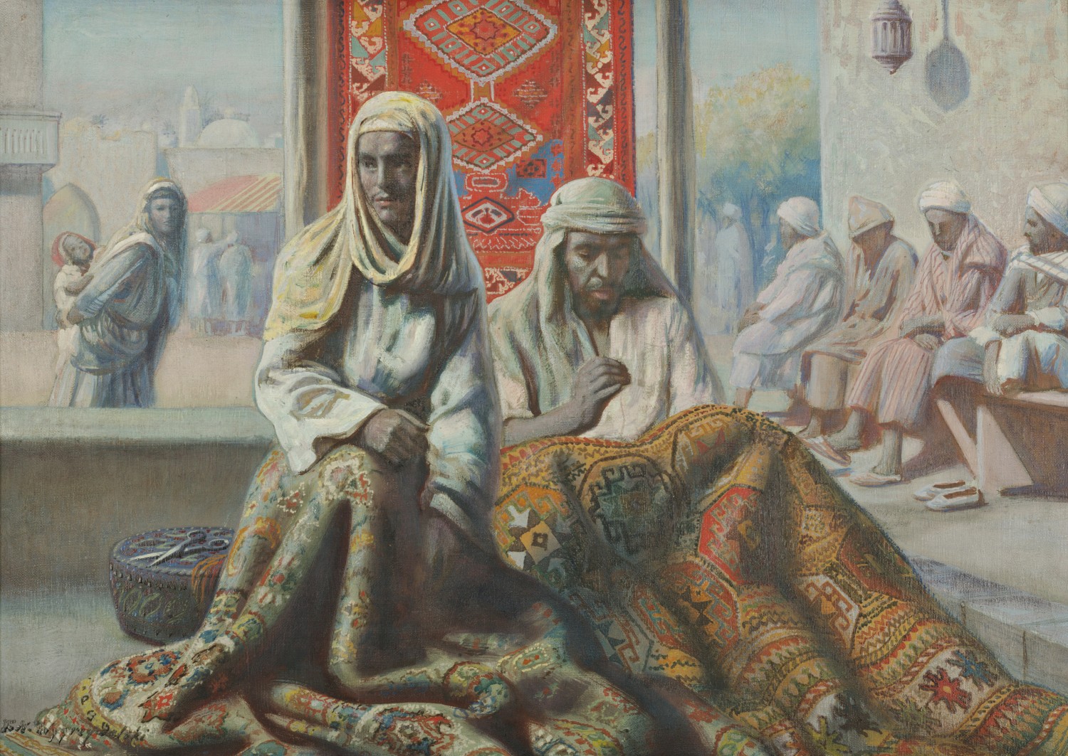 Praca jest utrzymana w łagodnej, pastelowej gamie barwnej, z wyraźnymi akcentem kolorystycznym w partii dywanu. Cała gama barwna została zdominowana przez odcienie różu, które wpływają na wiarygodne odtworzenie bliskowschodniego klimatu.