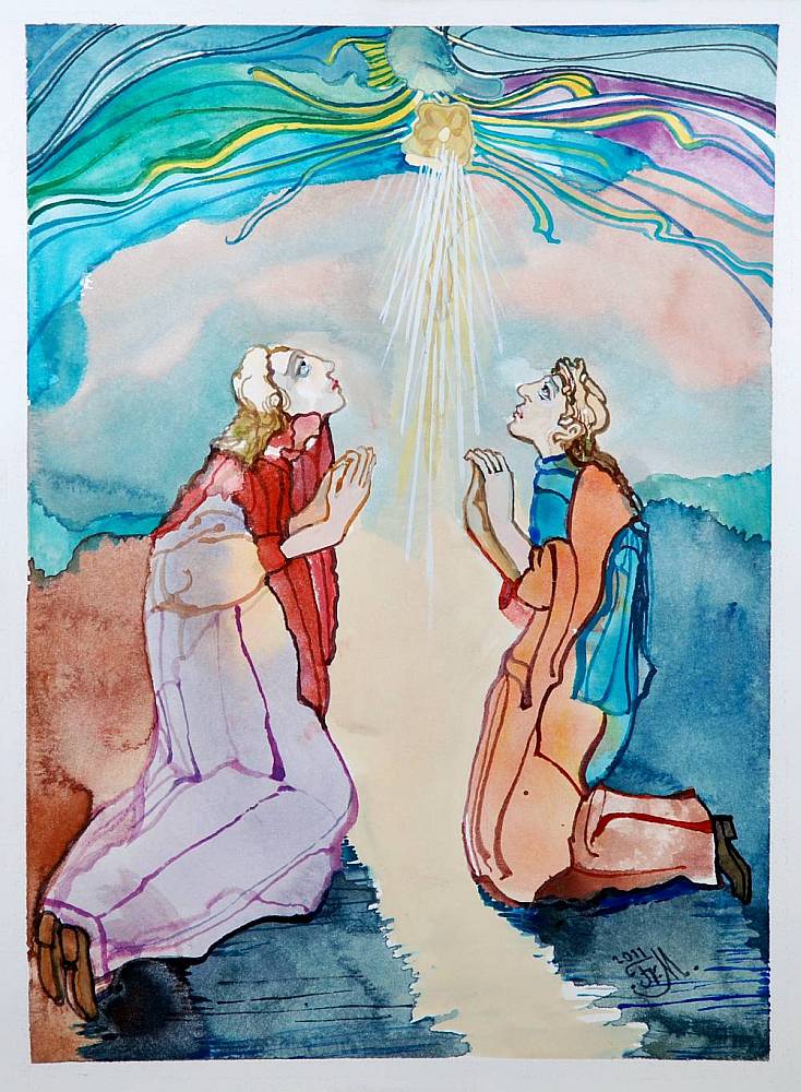 | Artystyczny świat Franciszka Maśluszczaka jest niezwykle baśniowy. Intensywne kolory sączą się z jego odrealnionych pejzaży. W prawie każdej pracy pojawia się postać, często zniekształcona. W prezentowanej pracy - "Bez tytułu" jest podobnie. Wykonana w technice akwareli kompozycja przedstawia dwie postaci. Klęczące ze złożonymi dłońmi patrzą intensywnie w górę, gdzie spomiędzy obłoków niczym ze źródła wydobywają się promienie. (AS) | |