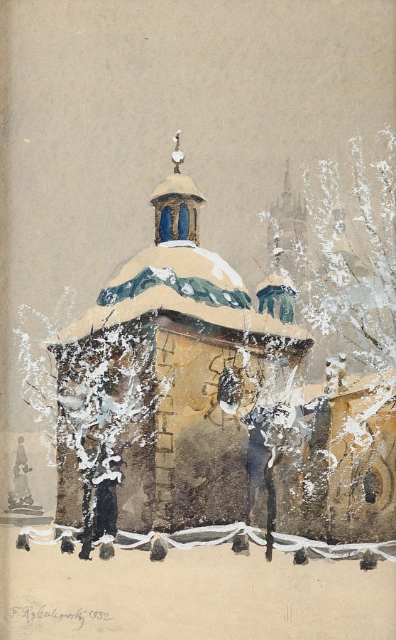 Franciszek Rybakowski był krakowskim artystą, którego twórczość przypadła na okres dwudziestolecia międzywojennego. Malarz wykorzystywał najczęściej technikę akwareli, malował tematy związane z Krakowem, głównie architekturę tego miasta (np. widoki Wawelu, Rynku czy kościoła św. Barbary). Franciszek Rybakowski często ukazywał Kraków zimą. Elementem charakterystycznym prac artysty są świetliste, białe bliki.