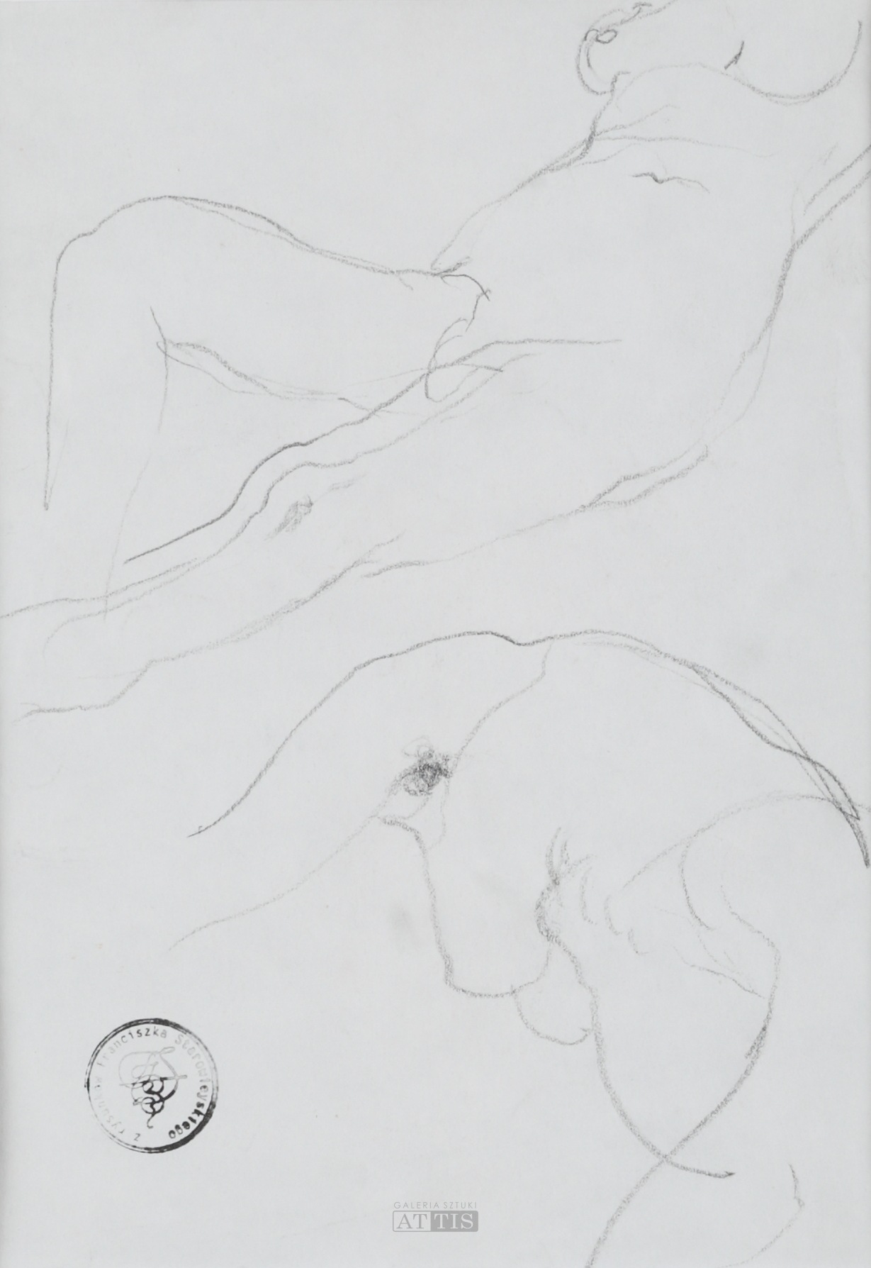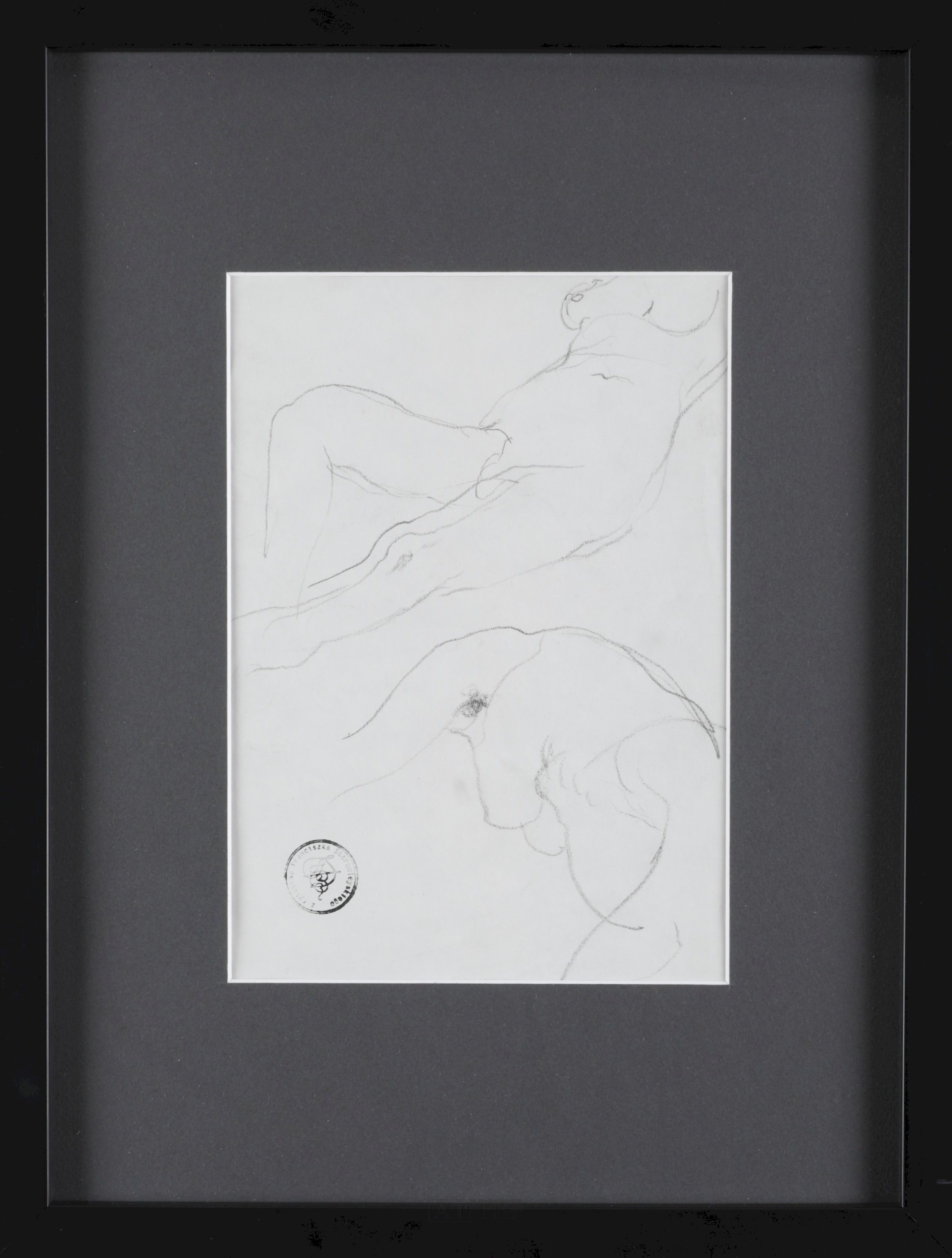 | L.d. okrągła pieczątka "Z rysunków Franciszka Starowieyskiego" z monogramem wiązanym. Do rysunku dołączony certyfikat autentyczności wydany przez syna artysty - Jana Mikołaja Biberstein-Starowieyskiego. | |