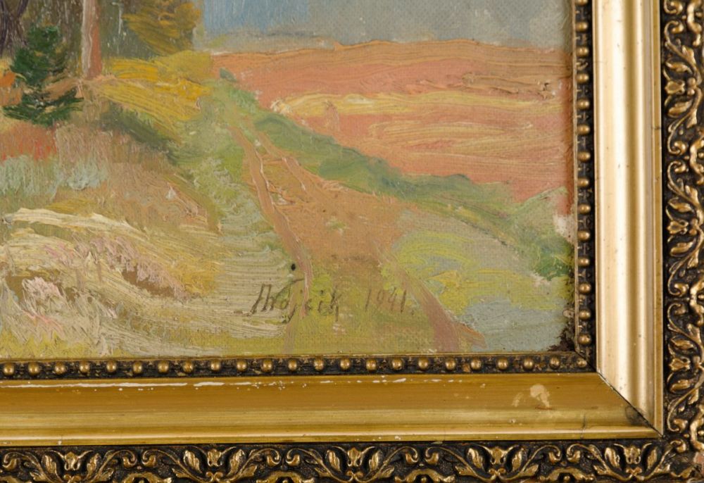| sygn. p.d.: "FWójcik 1941" OPIS PRACY: Obraz Franciszka Wójcika przedstawia typowy dla tego malarza temat pejzażu tatrzańskiego. Na pierwszym planie artysta ujął barwną polanę z samotną, stanowiącą ciężar kompozycyjny sosną. W oddali widoczny jest las, ponad którym rozciąga się pasmo Tatr Wysokich. Franciszek Wójcik poprawnie uchwycił w swojej pracy nastrój pochmurnego dnia w górach. Zastosowana perspektywa powietrzna buduje poczucie głębi, a harmonijna kolorystyka i ciekawa, zróżnicowana faktura obrazu sprawia, że można na niego patrzeć godzinami. PRACA ZOSTAŁA SPRZEDANA na IV Aukcji Dzieł Sztuki w Krakowskim Domu Aukcyjnym (16 lipca 2020) [zobacz więcej - link] | |
