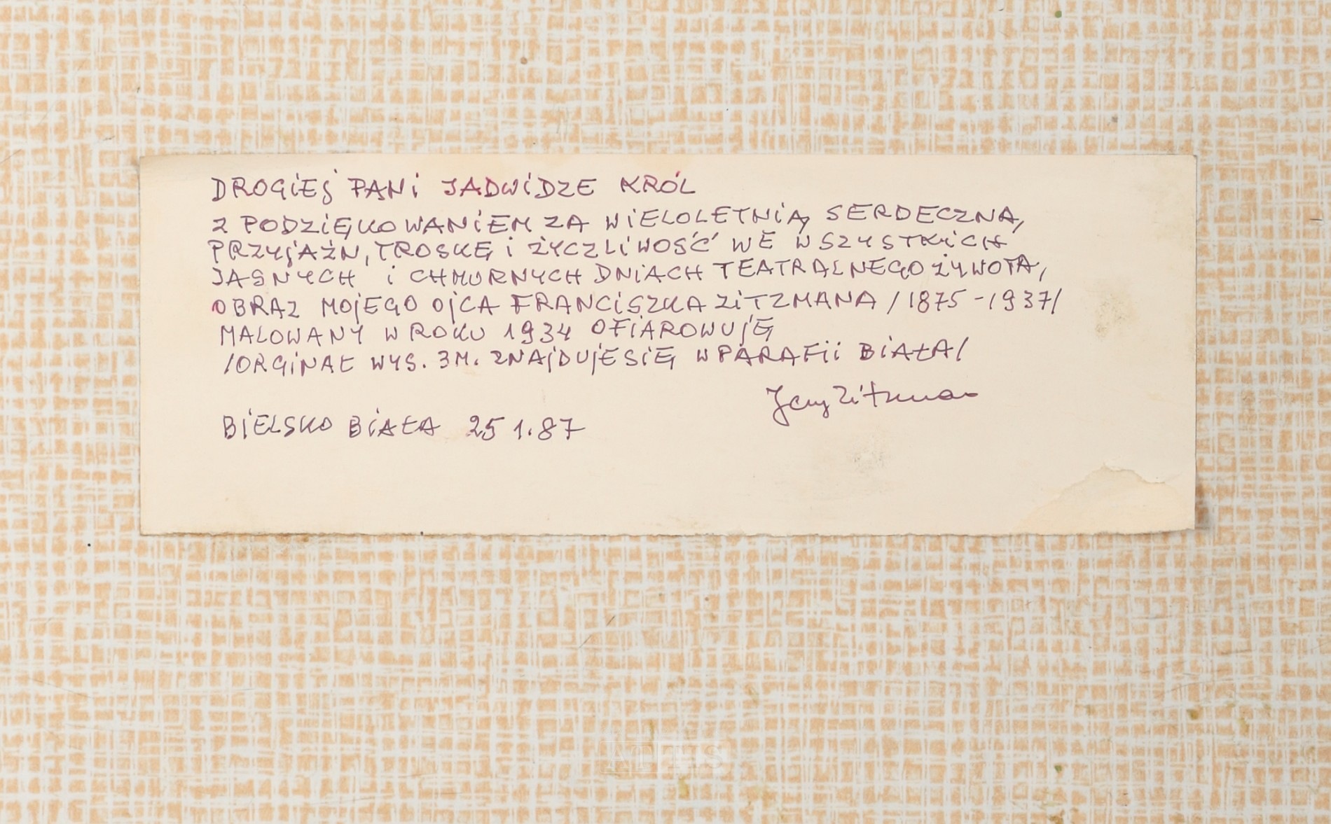 | Na odwrocie dedykacja Jerzego Zitzmana, syna artysty, z 1987 roku. W dolnej części obrazu widoczny ślad po przełamaniu podłoża. | |