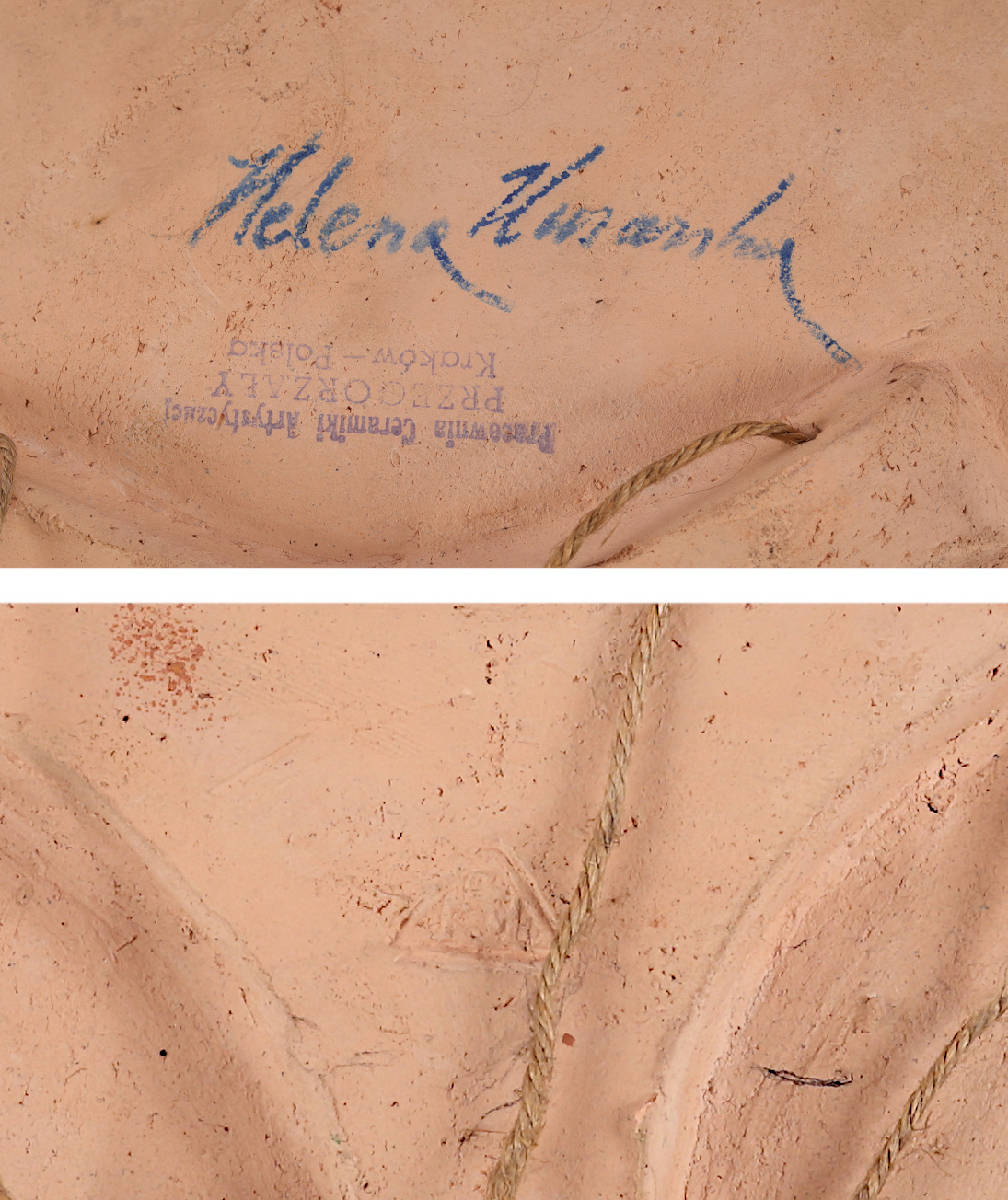 | Sygnowana na odwrocie: "Helena Husarska" Na odwrocie wycisk w masie oraz pieczątka "Pracownia Ceramiki Artystycznej | PRZEGORZAŁY | Kraków-Polska" | |