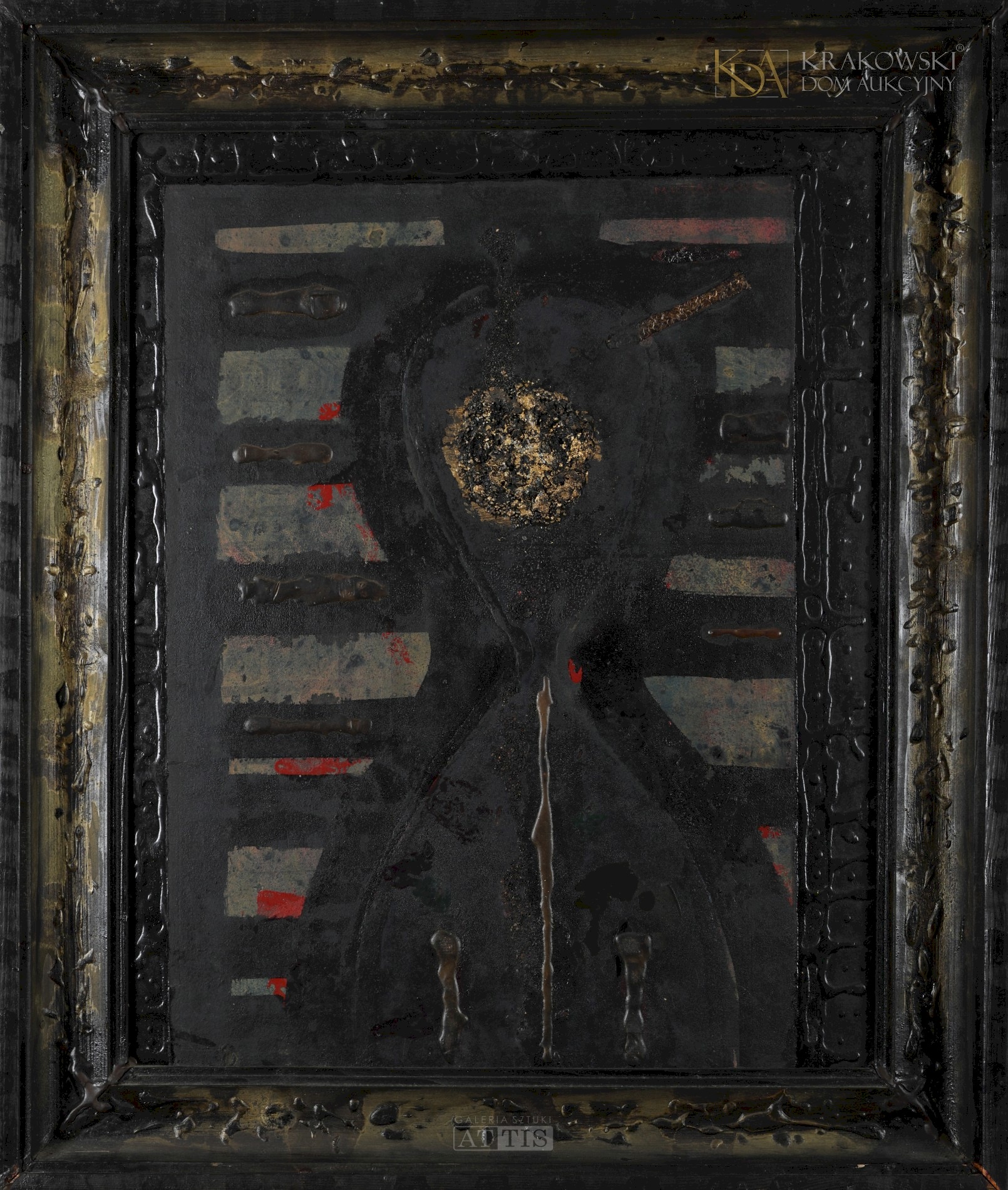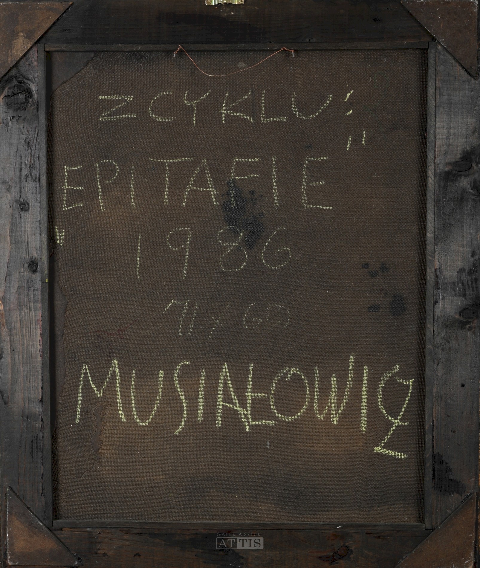 | Sygnowany p.g.: "MUSIAŁOWICZ" Opisany na odwrocie: "Z CYKLU: | EPITAFIE | 1986 | 71 x 60 | MUSIAŁOWICZ" | |