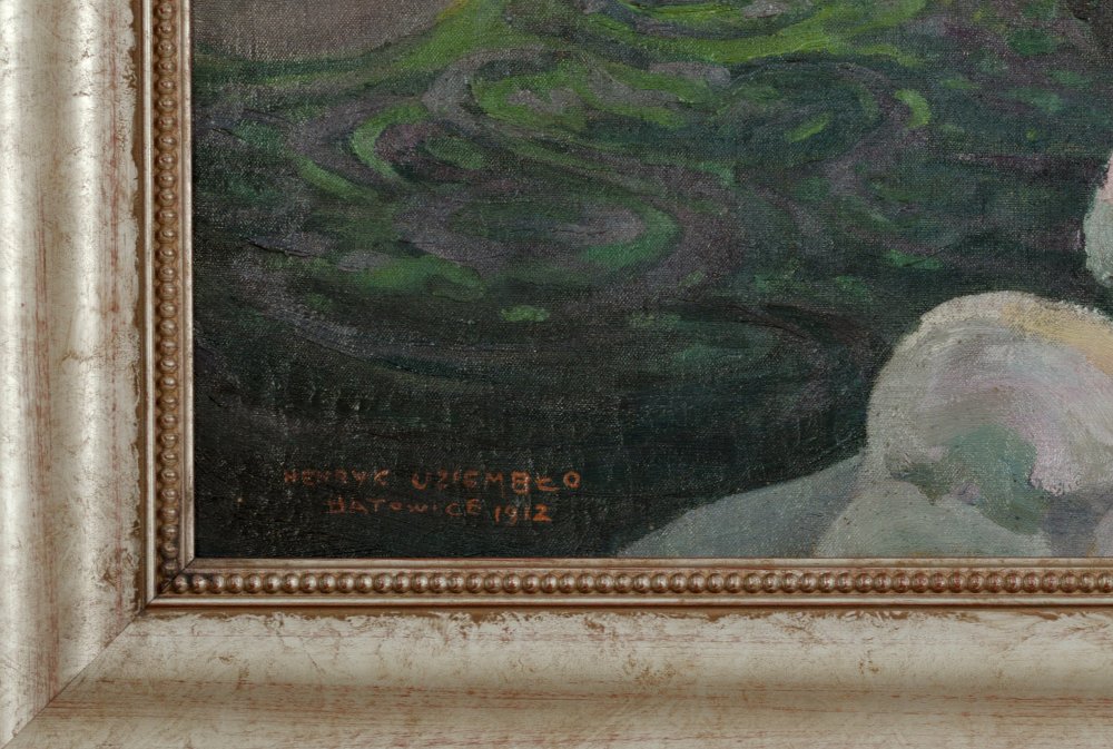 | Sygnowany i datowany l.d.: "HENRYK UZIEMBŁO | BATOWICE 1912” Na odwrocie pracy dwie metki: - Towarzystwo Przyjaciół Sztuk Pięknych w Krakowie, - Salon (metka niekompletna). OPIS PRACY: Obraz Henryka Uziembły przedstawia wieczorny, zimowy widok podkrakowskich Batowic. Malarstwo pejzażowe, obok sztuki monumentalno-dekoracyjnej, było główną domeną twórczości artysty. Malarz potrafił bardzo trafnie oddawać nastrój ukazywanego widoku i barwę obecnego w nim światła, co jest po części efektem inspiracji artysty sztuką Jana Stanisławskiego i impresjonistów francuskich. “Zima w Batowicach” wyróżnia się przy tym bardzo zróżnicowaną fakturą malarską i choć w obrazie dominują partie malowane impastowo, to miejscami lico obrazu traktowane jest bardzo płasko i subtelnie. Kontrast bardzo ciepłych, czerwonawych brązów ukazanej architektury oraz zimnych bieli i fioletów śniegu przyciąga wzrok i budzi bardzo przyjemne odczucia estetyczne. | |