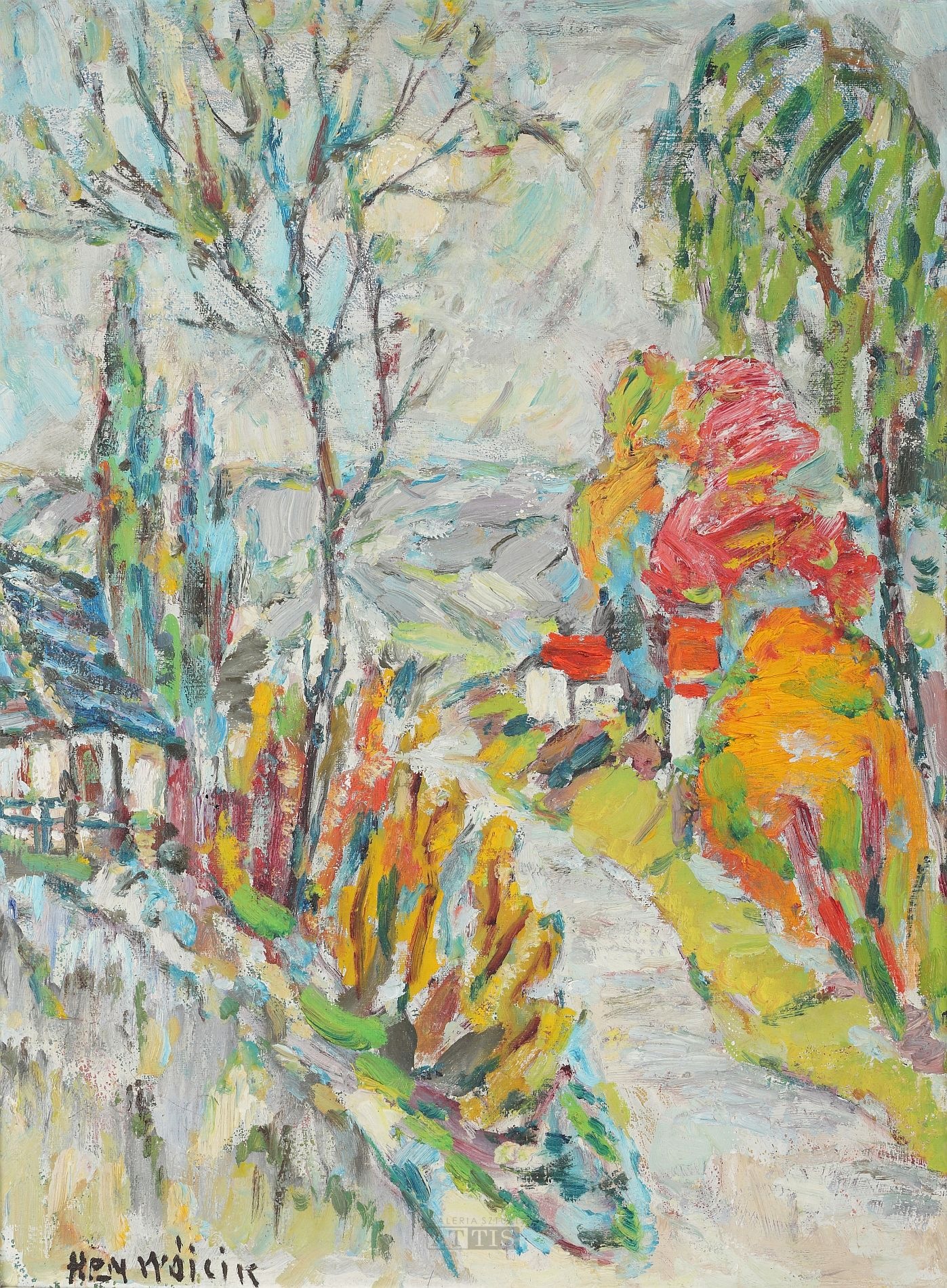 OPIS PRACY: "Pejzaż z drogą" autorstwa Henryka Wójcika zwraca uwagę swoją wielobarwnością i złożoną fakturą malarską. Artysta w reprezentatywny dla siebie sposób stworzył kolorystyczną kompozycję, która poprzez swój impresjonistyczny charakter zachwyca feerią przenikających się barw. Prezentowana praca od strony formalnej jest nader malarska. W tym przypadku temat pejzażu z drogą ciągnącą się pomiędzy domami stał się jedynie pretekstem do ukazania tego, w jaki sposób barwa i ekspresyjna faktura mogą ze sobą harmonijnie współgrać. | |