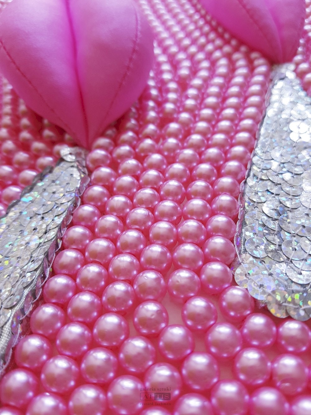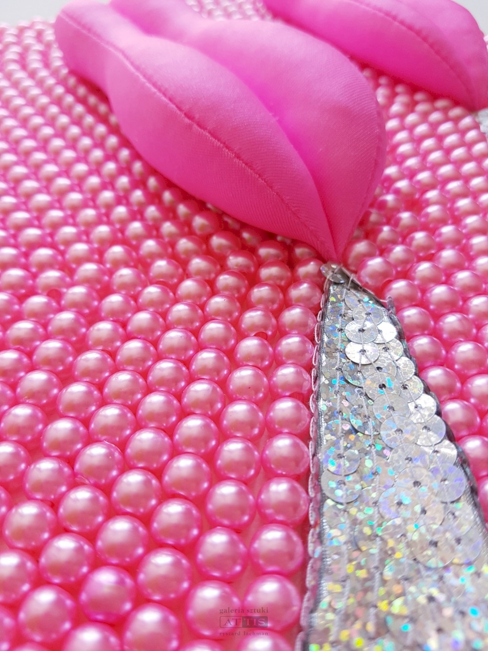 | Technika: | technika własna (cekiny, sztuczne perły, lycra, wypełnienie poliestrowe, akryl, gąbka), płótno |
