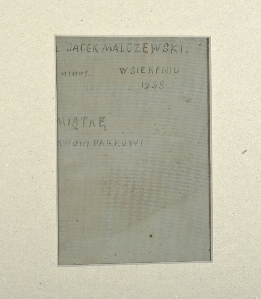 | Opisany na odwrocie (napis częściowo obcięty): "[MALOW]AŁ JACEK MALCZEWSKI | 5 MINUT W SIERPNIU | 1928 | [NA P]AMIĄTKĘ | [WŁADYS]ŁAWOWI PANKOWI" Praca posiada opinię dr Stefanii Krzysztofowicz-Kozakowskiej. Praca została sprzedana na VI AUKCJI DZIEŁ SZTUKI (14 XII 2020) Krakowskiego Domu Aukcyjnego [zobacz wyniki] | |