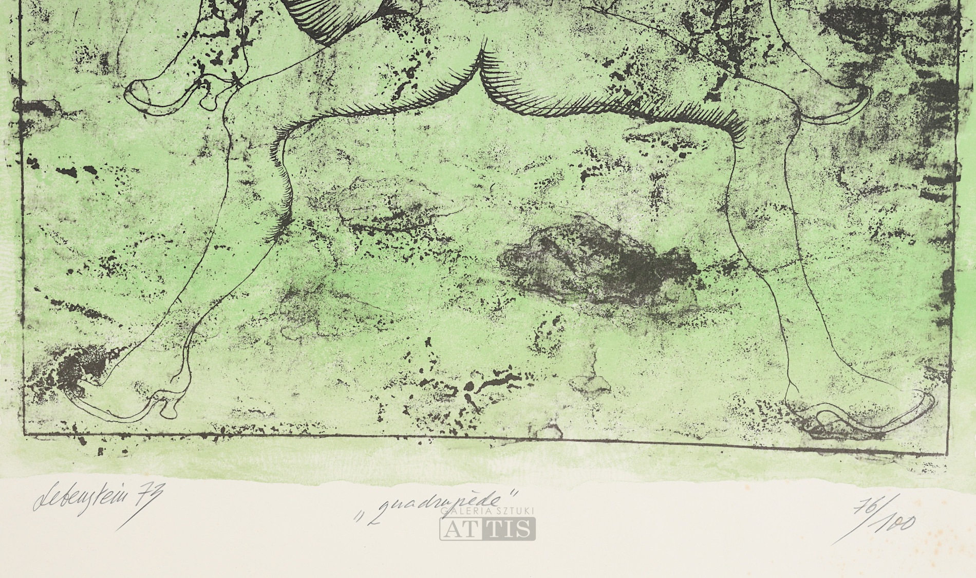 | Sygnowana i datowana ołówkiem l.d.: "Lebenstein 73" Opisana ołówkiem śr.d.: "quadrupède", p.d.: "76/100" P.d. widoczne niewielkie naderwanie podłoża. Przy dolnej krawędzi arkusza delikatnie widoczne ślady po zagięciach podłoża. | |