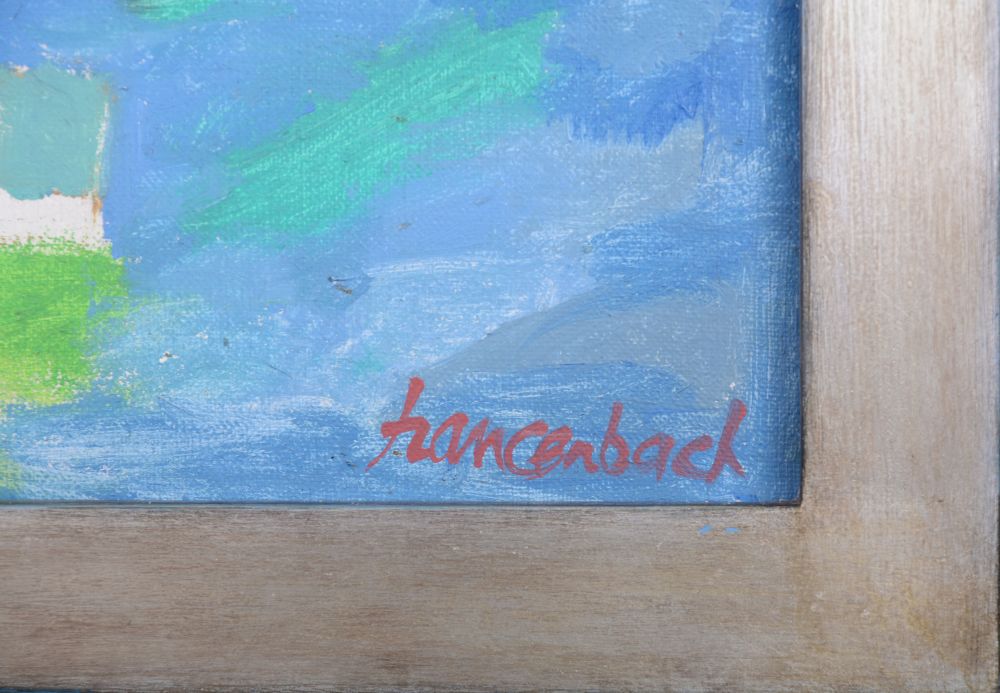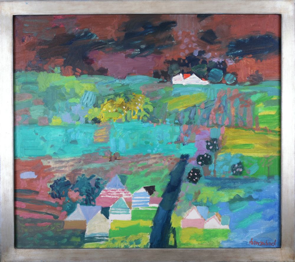 | sygnowany p.d.: "Szancenbach" autorski opis na odwrocie: "JAN SZANCENBACH | PEJZAŻ Z CIEMNYM NIEBEM IV | 1977" opis pracy: Praca Jana Szancenbacha przedstawia wiejski pejzaż z domami oraz szerokimi połaciami pól i łąk poprzedzielanych bujnymi zagajnikami. Nad tym widokiem rozciąga się tytułowe, ciemne, bordowo-granatowe niebo. Praca malowana jest ekspresyjnie, nasyconą paletą barw. Długie i energiczne pociągnięcia pędzla tworzą tworzą liczne impasty, które wzbogacają fakturę obrazu. W oparciu o analizę porównawczą z innymi pracami artysty można mniemać, że „Pejzaż z ciemnym niebem” przedstawia widok z Lanckorony. | |