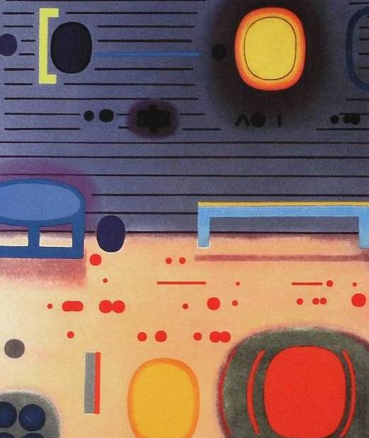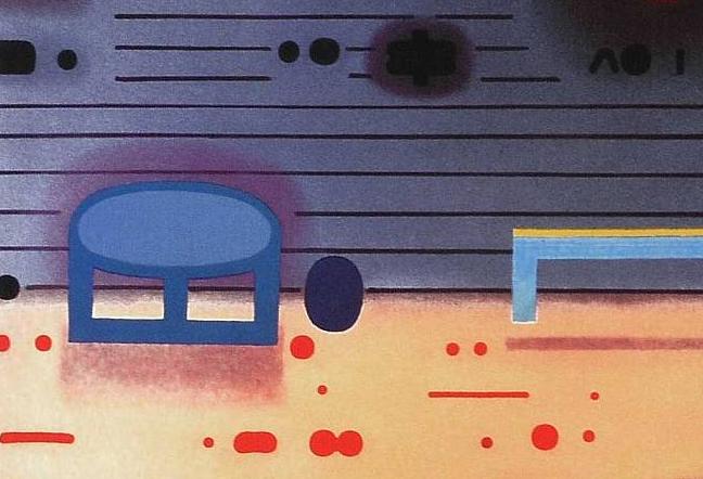 | Sygnowana ołówkiem p.d: "JTarasin 08" Opisana ołówkiem p.d.: "Dwie strefy", śr.d.: "17/69" Praca Jana Tarasina pt. "Dwie strefy" została wykonana w technice serigrafii, która polega na przetłoczeniu farby przez sito i odbiciu wzoru na papierze. Kompozycja została podzielona na tytułowe dwie strefy. Górna część utrzymana jest w błękitach, natomiast dół rozjaśniony jest żółcieniami. Dwie różne kolorystycznie przestrzenie zostały połączone abstrakcyjnymi kształtami. | |