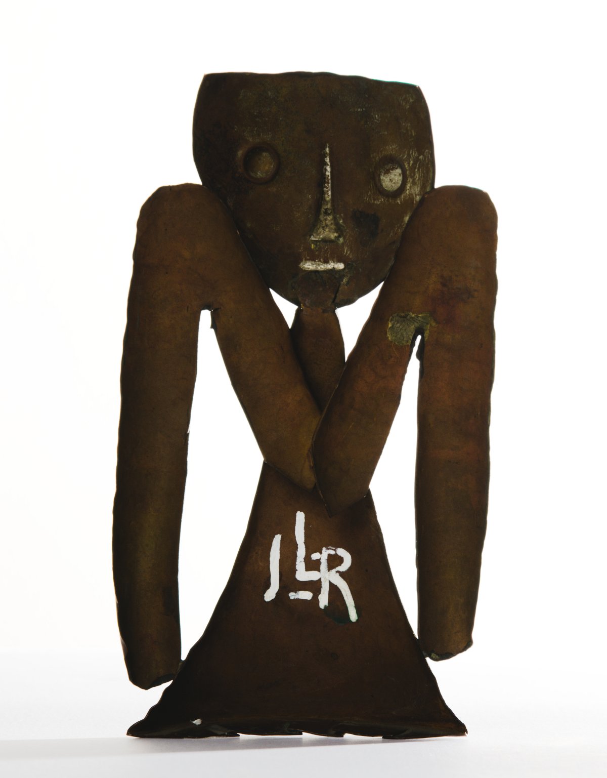 | sygn. na odwrocie: „JL-R” OPIS PRACY: Miedziana, oszczędna kompozycyjnie rzeźba Jeana Lamberta-Ruckiego wyróżnia się na tle gładkich, wypolerowanych dzieł dorobku artystycznego rzeźbiarza, dzięki osiągniętej techniką młotkowania nieregularnej powierzchni. Praca jest wynikiem inspiracji sztuką Afryki, co najwyraźniej przejawia się w anielskiej twarzy-masce. W omawianej pracy artysta prawdopodobnie nawiązał do charakterystycznych, związanych z kultem przodków relikwiarzy środkowoafrykańskiego ludu Kota. Paralelna jest tutaj przede wszystkim symbolika przodka oraz anioła jako opiekuna. | |