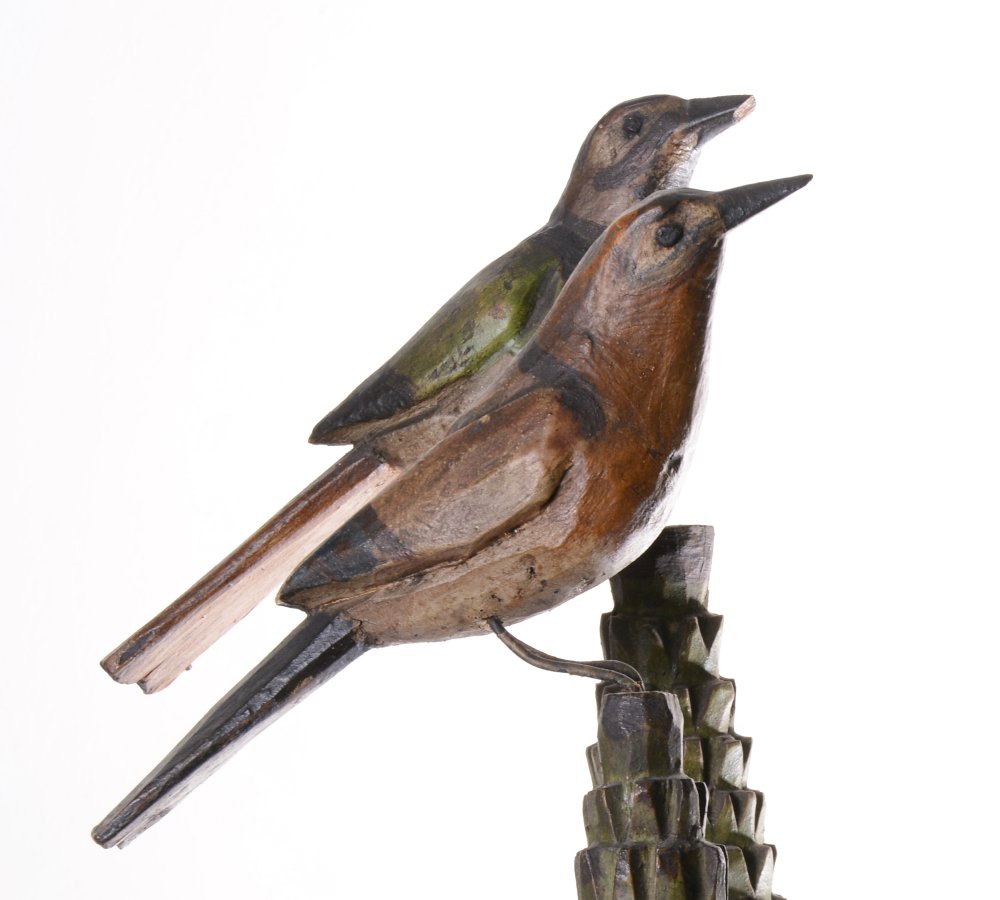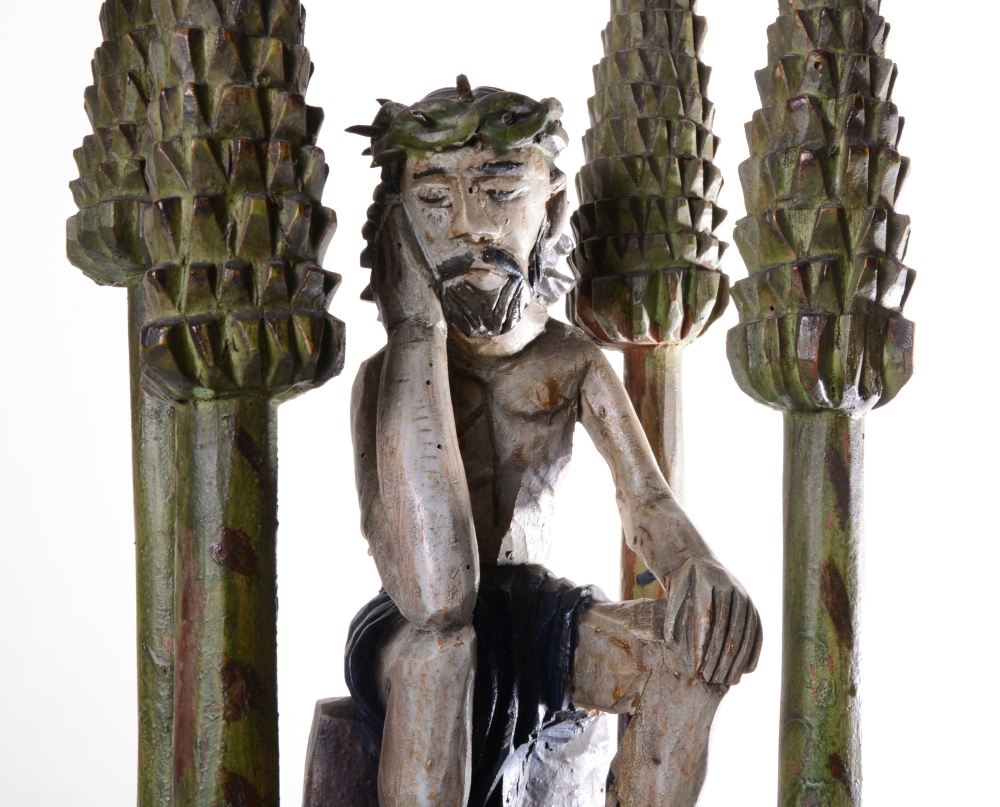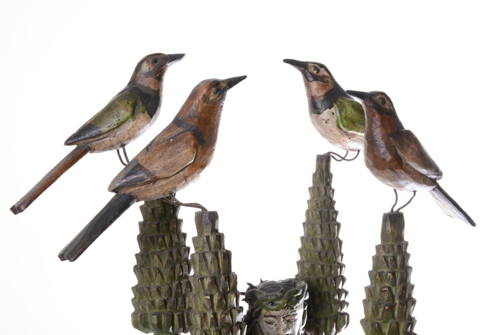 Opis pracy: Jędrzej Wowro urozmaicał rzeźbione przez siebie świątki elementami natury: drzewami nazywanymi przez świątkarza "tompolkami" oraz kunsztownie wyciosanymi sylwetkami ptaków. Artysta wspominał często, że to właśnie ptaszek był pierwszą wyrzeźbioną przez niego figurką, którą stworzył jeszcze jako mały chłopiec. Być może właśnie dzięki wieloletniej praktyce ptaki, które pojawiają się w jego rzeźbach są tak barwne i realistyczne jak można dostrzec w pracy "Chrystus Frasobliwy z ptaszkami". Zielone "tompolki" i siedzące na ich wierzchołkach ptaszki wydają się łagodzić głęboki smutek bijący z postawy i wyrazu twarzy Jezusa. Umiejscowione w czterech rogach wyglądają jak strażnicy, którzy nie pozwalają na dostęp do kontemplującego Chrystusa. Prace Wowry są rzadkością na rynku sztuki gdyż większość znajduje się w zbiorach muzeów. Rzeźby tego świątkarza są niezwykle cenione przez kolekcjonerów. | |