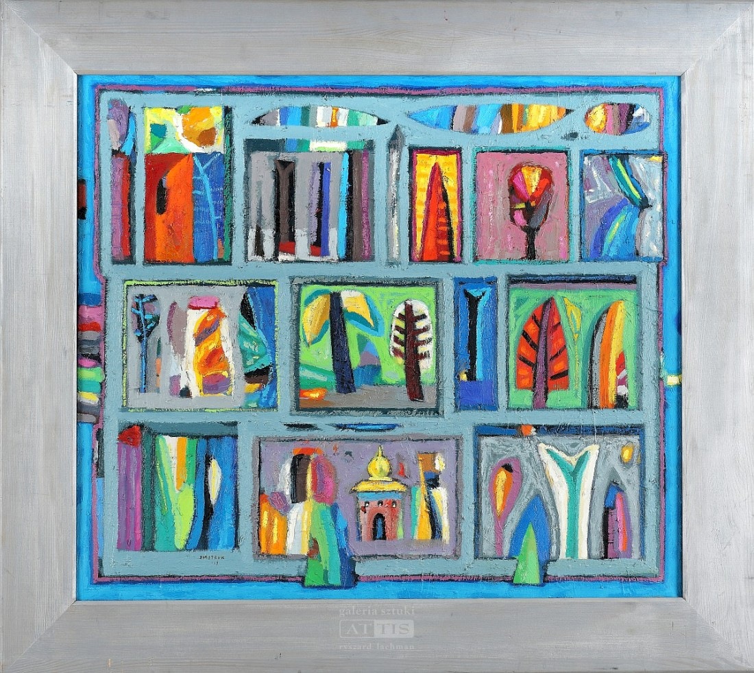 Kolejna wystawa w Galerii Attis przy ul. Starowiślna 14 bije w oczy kolorem. Jerzy Dmitruk – w grafice czarno-biały – w malarstwie uprawia orgię koloru. Dyplom zrobił na Wydziale Malarstwa, ale z powodzeniem uprawia grafikę, także ilustrację książkową, nie stroniąc od gatunków literackich niedosłownych. Dość powiedzieć, że ilustrował tomiki poetyckie m.in. Wisławy Szymborskiej i Ingeborg Bachmann.