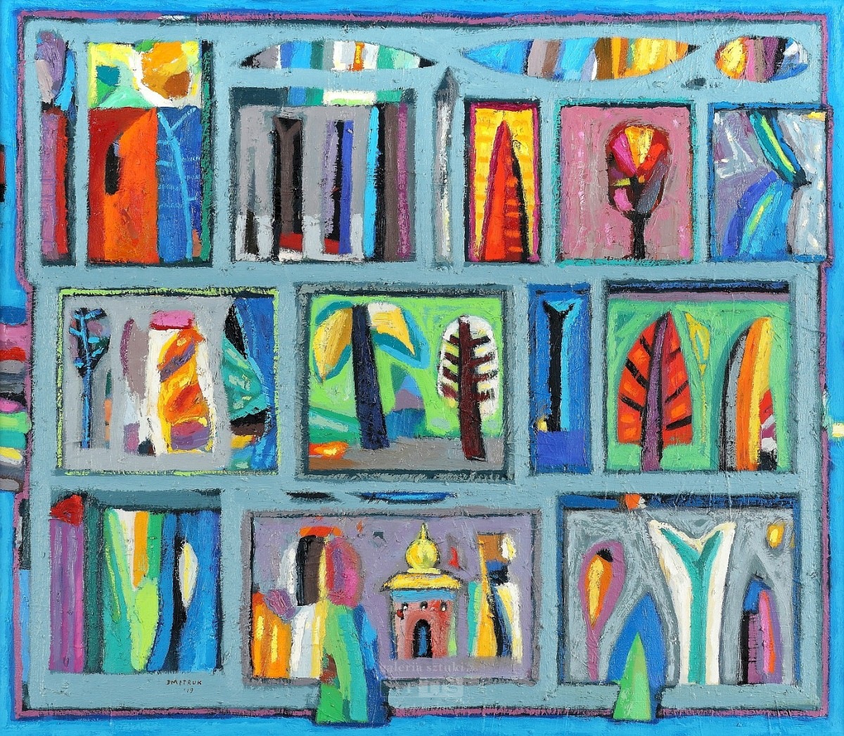 Przypatrując się obrazom artysty, należy zwrócić uwagę na ich kompozycje, która pomimo swojej pozornej niedbałości tworzy przemyślaną migotliwą mozaikę. Bogactwo form koegzystuje z mięsistością faktury płótna, którą niemalże chce się dotknąć. Liczne warstwy farby powstałe na przestrzeni lat tworzą zgrubienia i impasty, przenikają się wzajemnie potęgując soczystość barw. Serdecznie zapraszam do zanurzenia się w arkadyjski świat malarstwa Jerzego Dmitruka.