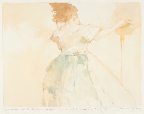 | Sygnowany i datowany l.d.: "J. Duda-G ‧ 1431/2004 ‧" OPIS PRACY: Jerzy Duda-Gracz - malarz, rysownik, scenograf, profesor sztuk plastycznych i wykładowca akademicki. Znany był przede wszystkim ze swojego satyrycznego spojrzenia na otaczającą go rzeczywistość. Malarstwo Jerzego Dudy-Gracza budziło emocje ze względu na silne zniekształcenia postaci przedstawianych zwykle groteskowo i prześmiewczo, aby w sposób dosłowny piętnować ludzkie słabości, przywary, lęki i kompleksy. Malarz chętnie sięgał też do tematów społecznych i politycznych, które komentował w sposób trafny i ostry. Prezentowana praca, przedstawiająca ułana i kobietę, z pozoru wydaje się być ujęciem rzewnym i podniosłym, ukazującym pewien rodzaj hołdu lub ukłonu w stronę żołnierza złożonego przez staruszkę. Faktycznie stanowi jednak transpozycje znanego w sztuce polskiej motywu malarskiego, który artysta potraktował w sposób satyryczno-metaforyczny. Sylwety obu postaci zostały mocno zróżnicowane. Skulonej, zgarbionej kobiecie, ledwo trzymającej się na rachitycznych nogach, malarz przeciwstawił wydłużone ciało postawnego żołnierza. Wertykalizm wyznaczony przez postać mężczyzny kontrastuje z esowatą figurą kobiecą. Układ hierarchiczny pozwala górować ułanowi nad staruszką. W interpretacji patriotycznej on może stanowić uosobienie siły i rycerskich ideałów hołubionych w tradycyjnym malarstwie, ona zaś słabość i uciemiężenie, zdecydowanie bardziej właściwe dla narracji na temat ograbionej i zniewolonej ojczyzny. Zestawienie tych dwóch postaci mogło być też rodzajem satyrycznego komentarza odnoszącego się do upowszechnionego w malarstwie polskim, romantyzowanego motywu obyczajowego przedstawiającego ułana i dziewczynę. Praca, wykonana w technice akwareli, malowana jest swobodnie i szkicowo w jasnych, chłodnych barwach. Ciepłe plamy żółtego i pomarańczowego koloru nad głowami figur pełnią funkcję akcentów przykuwających wzrok odbiorcy. Niedokończone sylwety postaci rozmywają się w tle, układając się w niedoprecyzowaną, otwartą, ekspresyjną kompozycję. | |