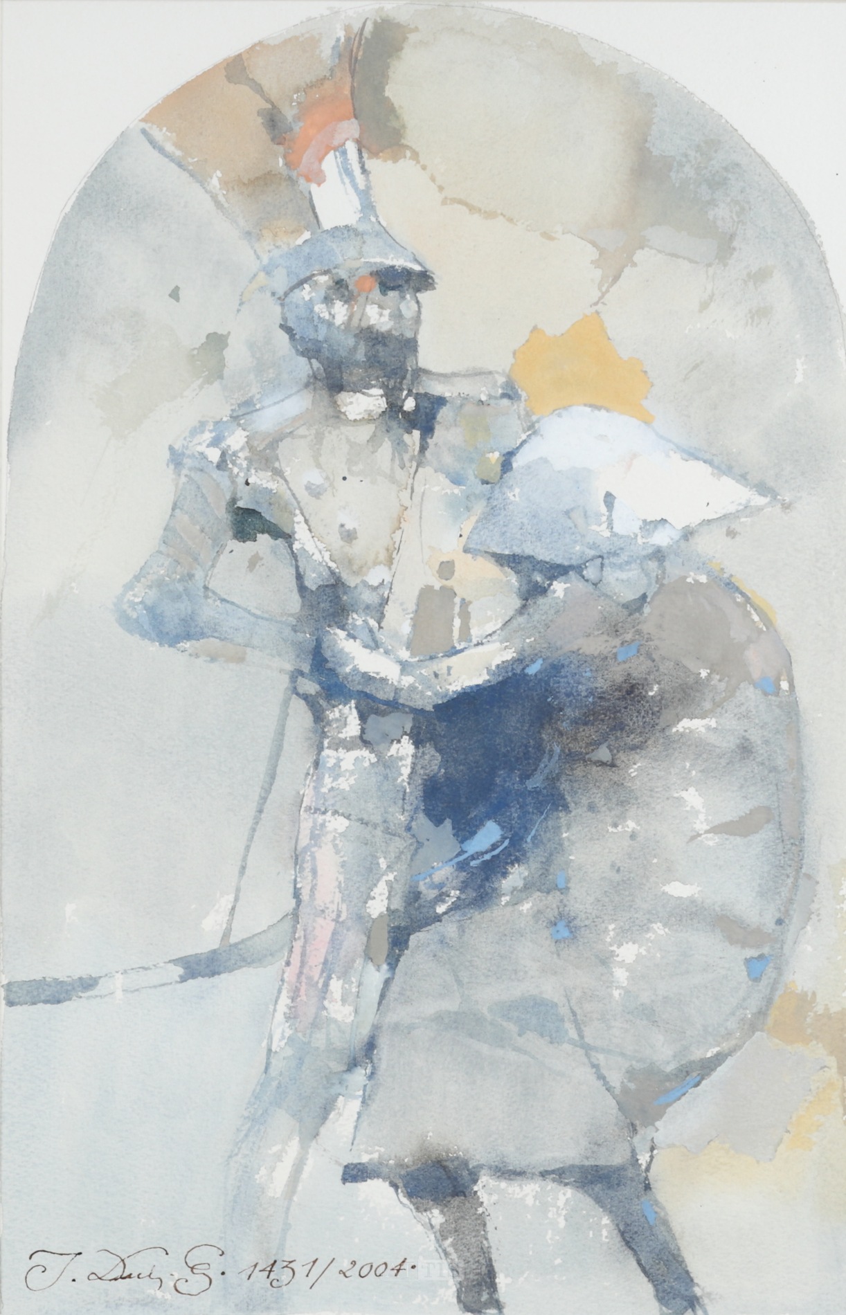 | Sygnowany i datowany l.d.: "J. Duda-G ‧ 1431/2004 ‧" OPIS PRACY: Jerzy Duda-Gracz - malarz, rysownik, scenograf, profesor sztuk plastycznych i wykładowca akademicki. Znany był przede wszystkim ze swojego satyrycznego spojrzenia na otaczającą go rzeczywistość. Malarstwo Jerzego Dudy-Gracza budziło emocje ze względu na silne zniekształcenia postaci przedstawianych zwykle groteskowo i prześmiewczo, aby w sposób dosłowny piętnować ludzkie słabości, przywary, lęki i kompleksy. Malarz chętnie sięgał też do tematów społecznych i politycznych, które komentował w sposób trafny i ostry. Prezentowana praca, przedstawiająca ułana i kobietę, z pozoru wydaje się być ujęciem rzewnym i podniosłym, ukazującym pewien rodzaj hołdu lub ukłonu w stronę żołnierza złożonego przez staruszkę. Faktycznie stanowi jednak transpozycje znanego w sztuce polskiej motywu malarskiego, który artysta potraktował w sposób satyryczno-metaforyczny. Sylwety obu postaci zostały mocno zróżnicowane. Skulonej, zgarbionej kobiecie, ledwo trzymającej się na rachitycznych nogach, malarz przeciwstawił wydłużone ciało postawnego żołnierza. Wertykalizm wyznaczony przez postać mężczyzny kontrastuje z esowatą figurą kobiecą. Układ hierarchiczny pozwala górować ułanowi nad staruszką. W interpretacji patriotycznej on może stanowić uosobienie siły i rycerskich ideałów hołubionych w tradycyjnym malarstwie, ona zaś słabość i uciemiężenie, zdecydowanie bardziej właściwe dla narracji na temat ograbionej i zniewolonej ojczyzny. Zestawienie tych dwóch postaci mogło być też rodzajem satyrycznego komentarza odnoszącego się do upowszechnionego w malarstwie polskim, romantyzowanego motywu obyczajowego przedstawiającego ułana i dziewczynę. Praca, wykonana w technice akwareli, malowana jest swobodnie i szkicowo w jasnych, chłodnych barwach. Ciepłe plamy żółtego i pomarańczowego koloru nad głowami figur pełnią funkcję akcentów przykuwających wzrok odbiorcy. Niedokończone sylwety postaci rozmywają się w tle, układając się w niedoprecyzowaną, otwartą, ekspresyjną kompozycję. | |
