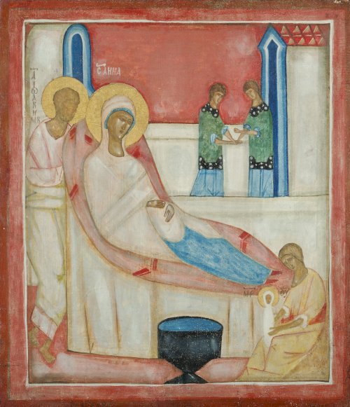 Wiara chrześcijańska i liturgia wschodnia, w której został wychowany artysta, stanowiły ważne elementy w życiu i twórczości Jerzego Nowosielskiego. Prezentowana ikona wykonana została tradycyjną techniką, z wykorzystaniem tempery i deski, z zachowaniem odpowiedniej dla ikon stylizacji bizantynizującej. Ukazuje ona apokryficzną scenę narodzenia Maryi. W prawym dolnym rogu widoczna jest figura przytrzymującej Maryję akuszerki, obok naczynie, w którym obmyte zostało niemowlę. Przy sylwetkach św. Anny i św. Joachima artysta umieścił ich imiona w języku cerkiewnosłowiańskim, natomiast blisko Marii grecki tytel Meter Theou. Praca była jedną z wersji ikony chramowej, jaka miała zostać umieszczona w ikonostasie cerkwi prawosławnej Narodzenia NMP w Gródku, we wnętrzu której Jerzy Nowosielski, we współpracy z Adamem Stalony-Dobrzańskim, zrealizował już wcześniej polichromię.