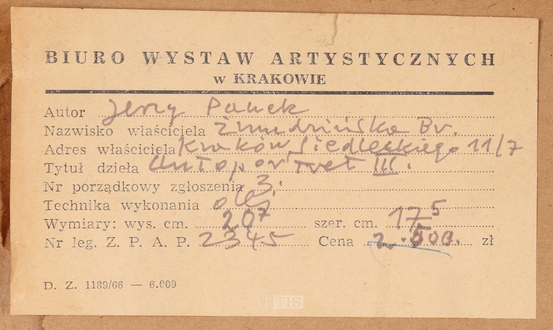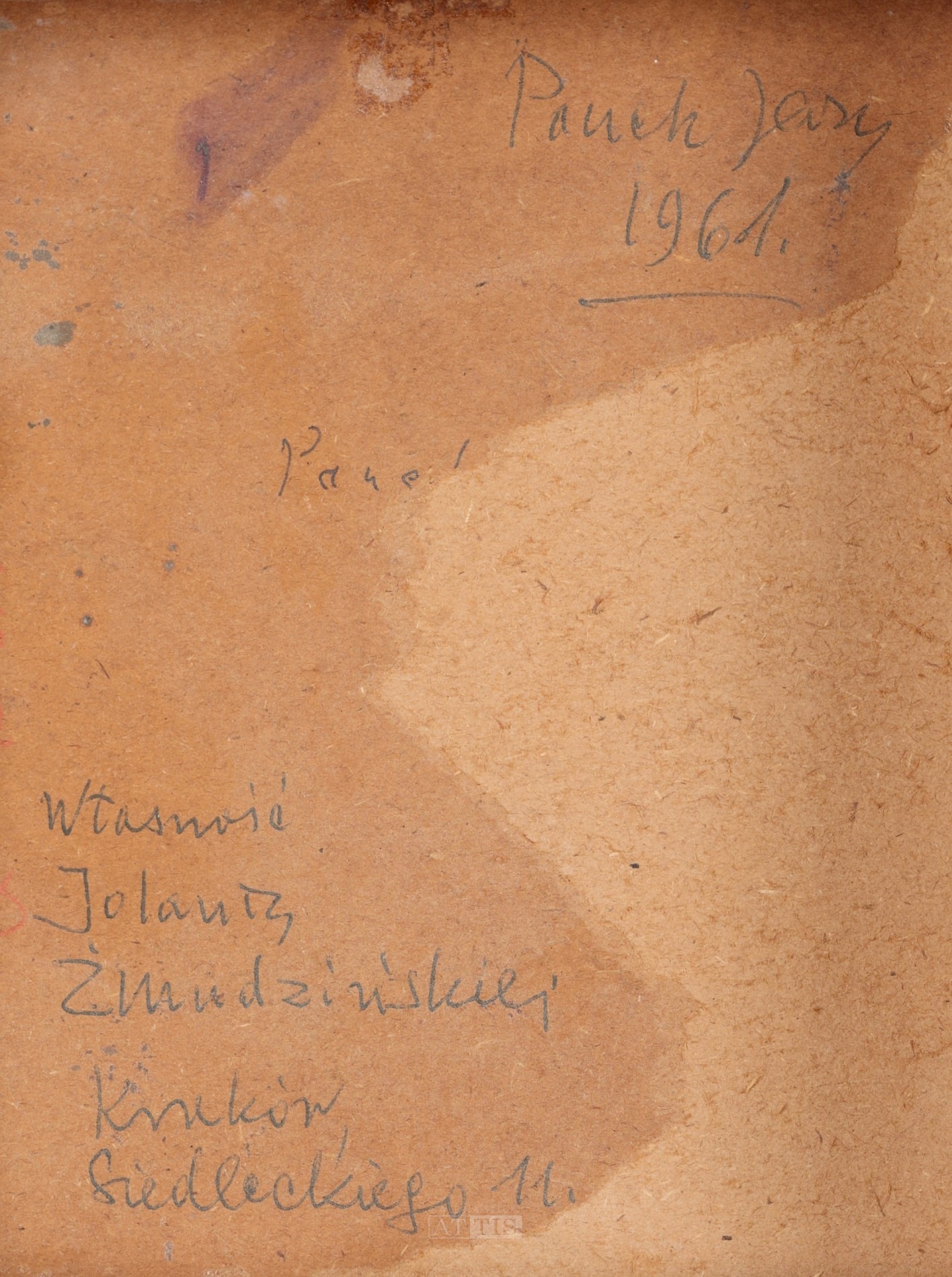 | Sygnowany i datowany na odwrocie: "Jerzy Panek | 1961." Opisany na odwrocie. Na odwrocie oprawy metka Biura Wystaw Artystycznych w Krakowie. Obraz został sprzedany na 41. Aukcji Dzieł Sztuki Krakowskiego Domu Aukcyjnego [ZOBACZ WYNIKI] | |