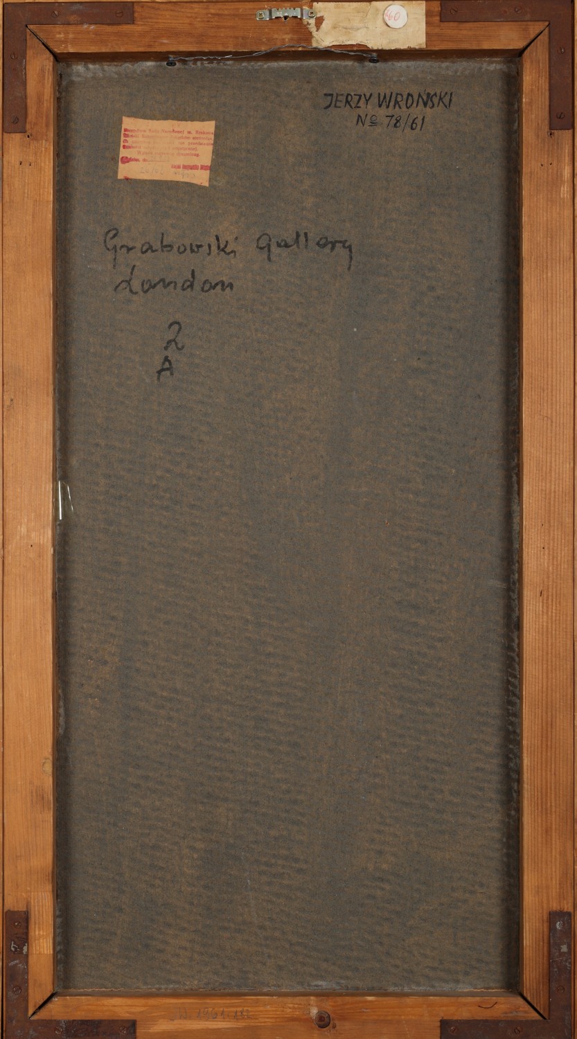 | Sygnowany i opisany na odwrocie: "JERZY WROŃSKI | No. 78/61" Opisany obcą ręką na odwrocie: "Grabowski Gallery | London | 2 | A" Na blejtramie metka z opisem obrazu w języku angielskim (z wystawy w The Grabowski Gallery w Londynie w 1962 roku (?)). Obraz reprodukowany w katalogu Jerzy Wroński. Obrazy-reliefy, akwarele metamorficzne, kopciogramy, Galeria Sztuki Współczesnej BWA w Katowicach, Katowice 2010, s. nn. | |