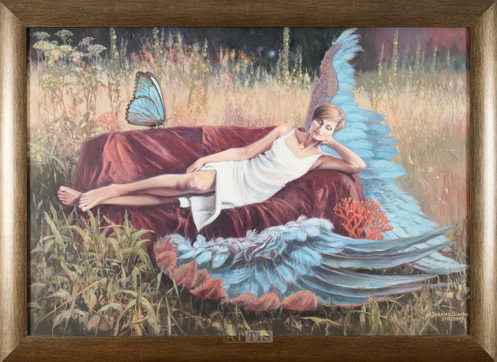 | Sygnowany p.d.: "Joanna Sierko | 510/2009" Opisany na blejtramie: "ODPOCZYNEK BŁĘKITNOSKRZYDŁYCH - 510 - 2009 r. - JOANNA SIERKO-FILIPOWSKA" | |