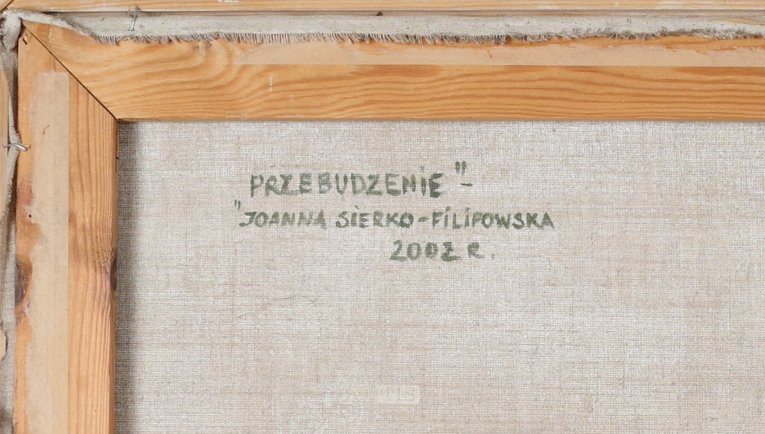 | Sygnowany i datowany p.d.: "Joanna | Sierko 2002" Opisany na odwrocie: "„PRZEBUDZENIE” - | JOANNA SIERKO-FILIPOWSKA | 2002 R." | |