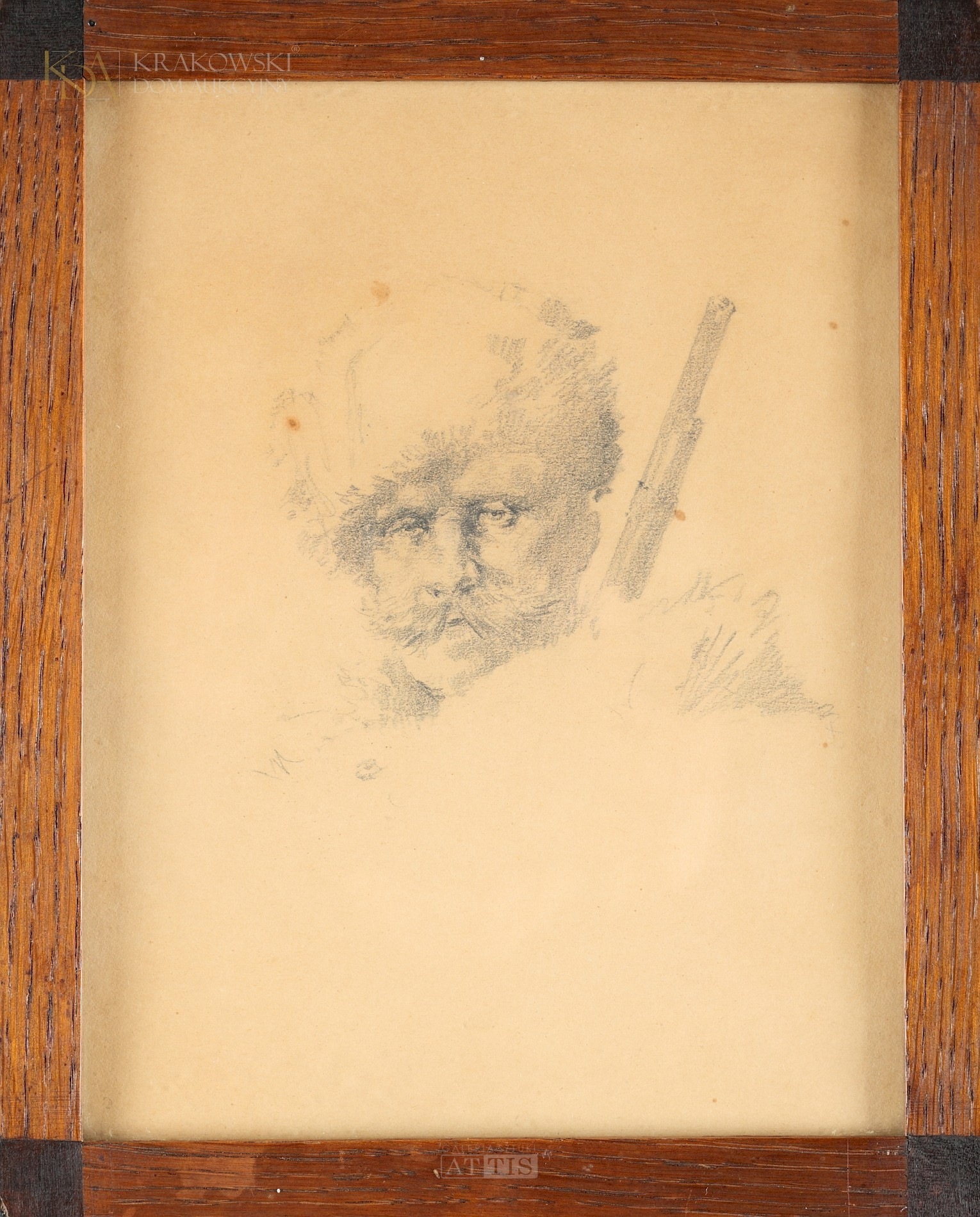 OPIS PRACY: Józef Brandt był polskim malarzem związanym z monachijskim środowiskiem artystycznym i twórcą wyjątkowych w swoim charakterze obrazów batalistycznych. W swojej sztuce artysta często przedstawiał historyczne postacie lisowczyków, którzy stanowili XVII-wieczną polską formację zbrojnej lekkiej jazdy. Lisowczycy, znani ze swojej skuteczności na placu boju, brawury i awanturniczej natury, stali się w malarstwie Józefa Brandta głównymi bohaterami licznych kompozycji. Ich sylwetki perfekcyjnie wpisywały się w pokrzepiającą serca narrację o wielkości, wielokulturowości i burzliwej historii I Rzeczypospolitej. Wyrosłe z ducha romantyzmu i realistyczne w formie obrazy Józefa Brandta odpowiadały oczekiwaniom polskiego społeczeństwa znajdującego się w okresie aktywności twórczej malarza pod zaborami. Prezentowana praca jest niezwykle starannym studium głowy rozpoznawalnej postaci lisowczyka, którego zakręcony wąs, futrzana czapa i arkebuz zawieszony na plecach trafnie oddają nieprzejednany charakter postaci, a także znakomicie odwzorowują elementy panującej w tym czasie mody sarmackiej. | |
