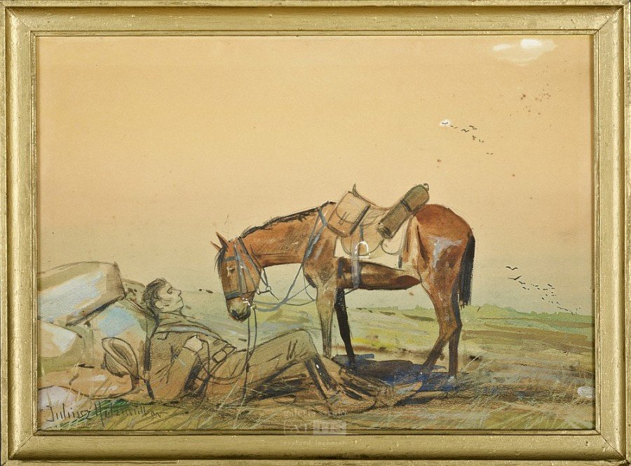 | Sygnowany ołówkiem l.d.: "Juliusz Holzmüller" Opisany na odwrocie ołówkiem: "Górny Śląsk | Kurjer z rozkazem zabity przez | niemców pod Gliwicami | Dnia 7 czerwca 1921" | |