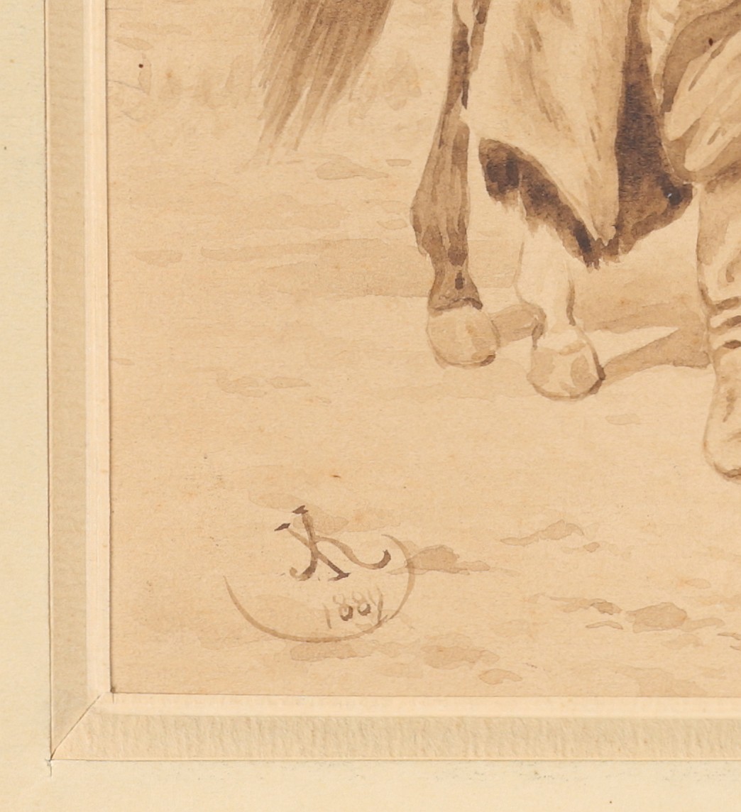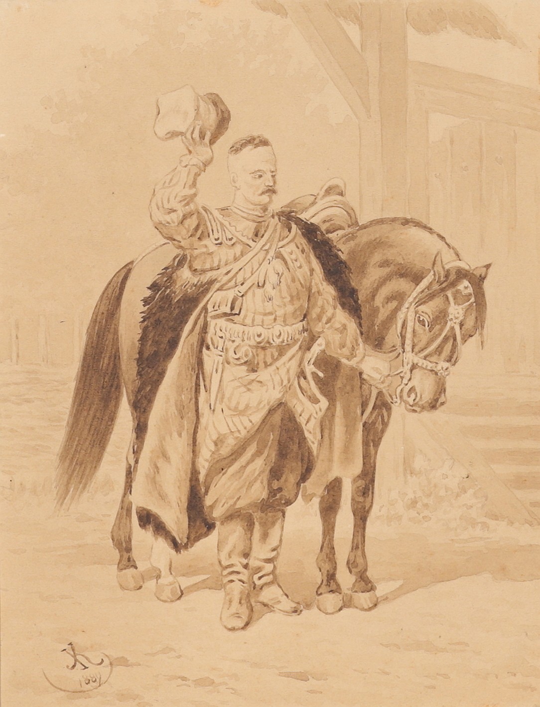 | Sygnowany i datowany l.d.: "JK | 1889" Do obrazu dołączona opinia wydana w 1942 roku przez Tadeusza Dobrowolskiego. Fragment opinii Tadeusza Dobrowolskiego: "Akwarela ta przedstawia szlachcica z podgoloną czupryną, trzymającego za uzdę konia i zdejmującego z głowy rogatywkę. Ponieważ poza nim widać drewniane wrota, wolno się domyślić, że szlachcic ów przybył do jakiegoś dworu i wita jego mieszkańców. [...] Swojski temat związany z polską tradycją rycerską jest bowiem typowy dla twórczości J. Kossaka. Na tego samego malarza jako autora malowidła, wskazuje jeszcze ostrożna technika akwarelowa, delikatny światłocień, pewna skłonność do linearnego konturowania formy, ilustratorski charakter całości, wreszcie atmosfera uczuciowa akwareli." | |