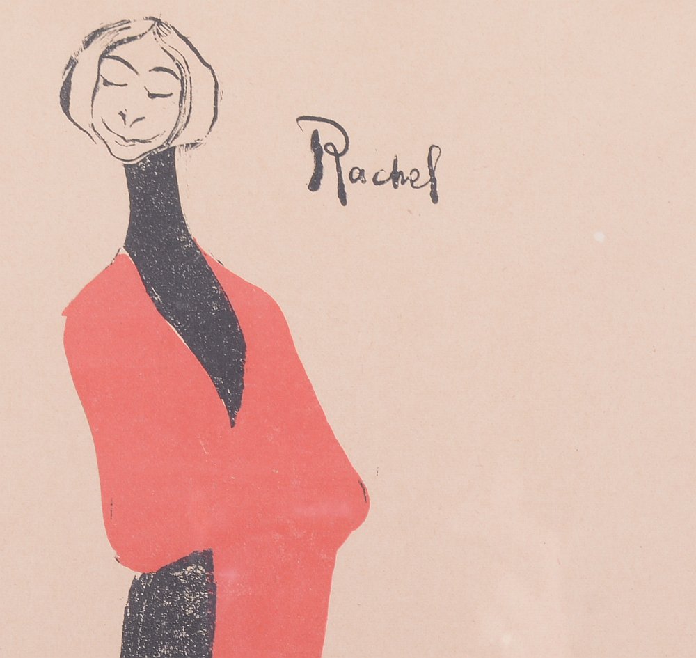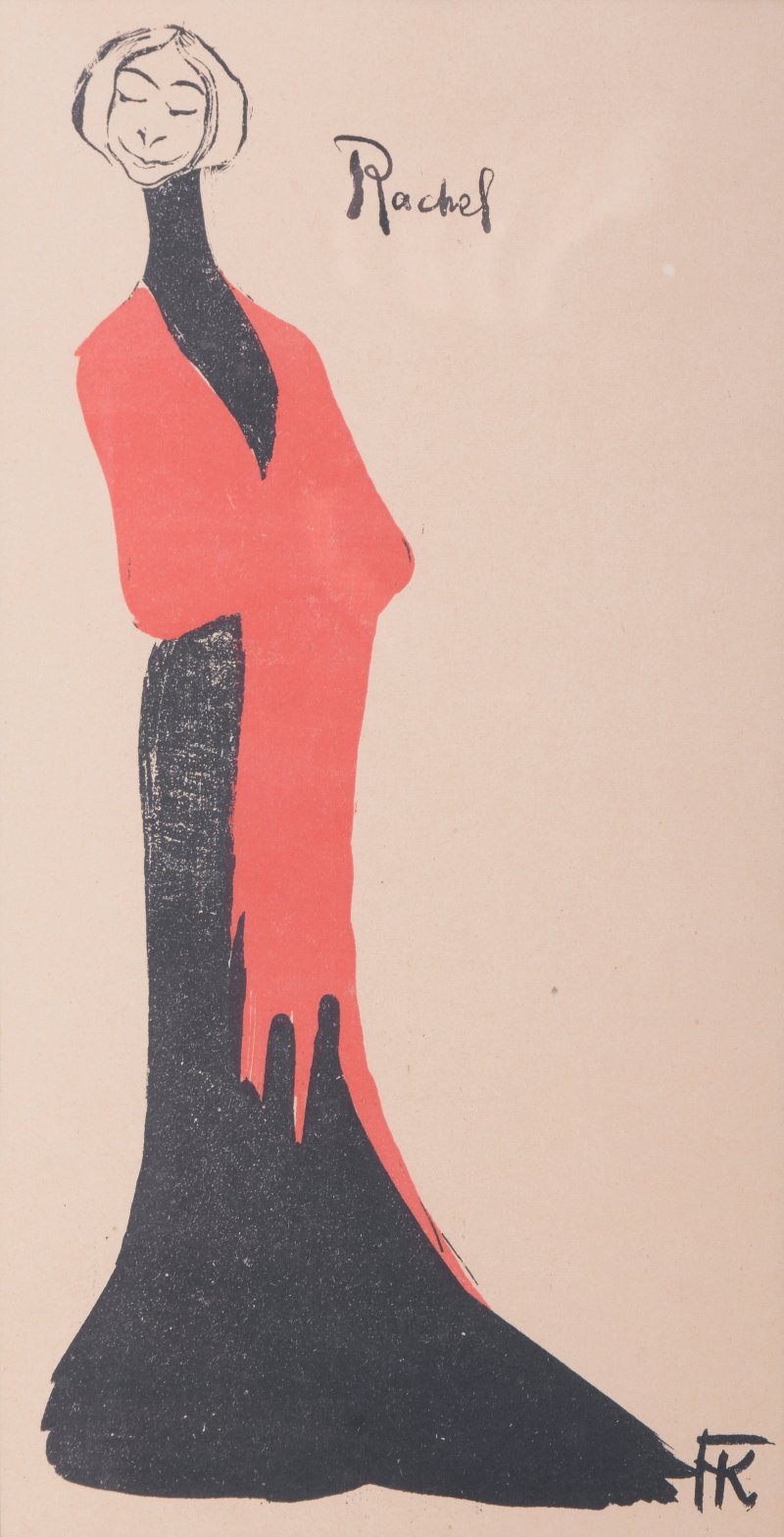 | sygnowana na płycie monogramem p.d.: "FK" napis na płycie śr.g.: "Rachel" opis pracy: Grafika Karola Frycza przedstawia cenioną na początku XX wieku młodą aktorkę Helenę Sulimę w roli Racheli z „Wesela” Stanisława Wyspiańskiego, którego premiera w krakowskim Teatrze Miejskim miała miejsce w 1901 roku. Rachel była córką bogatego Żyda, kobietą wykształconą, o poetyckim usposobieniu, zafascynowaną młodopolską kulturą i sztuką. Aktorka została ukazana w czarnej sukni o modnym wówczas kroju, z narzuconym na ramiona czerwonym szalem. | |
